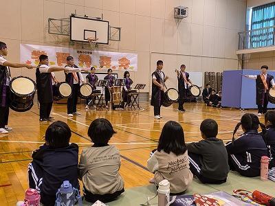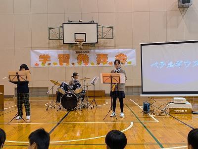 ほんとうにいろいろな役割が期待され、成果を発揮している3名による楽器演奏でした。雄々しい出し物が多かった中で、清涼感のある演奏は良かったです。ソロで「見せ場」を作ってもよかったですね。昨年は関口先生も共演されました。文化部の演奏には「できる」先生が入ってさらに盛り上げていってもいいですね。手話問題1で頭で手をぴょこぴょこする手話の回答「①犬です」・・・「あれ①はウサギだったぞ!!」と回答に参加していた私は、クレームを・・・と思いましたが小学生は冷静に???????となっていました。回答は②犬?