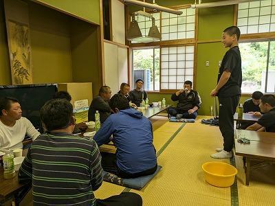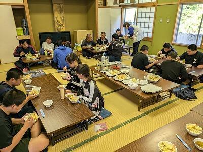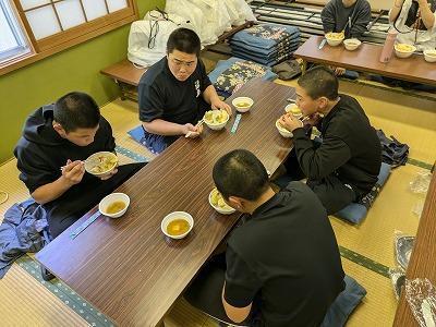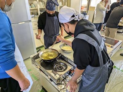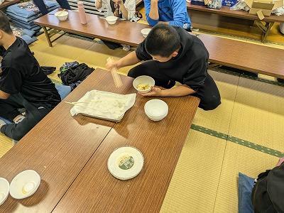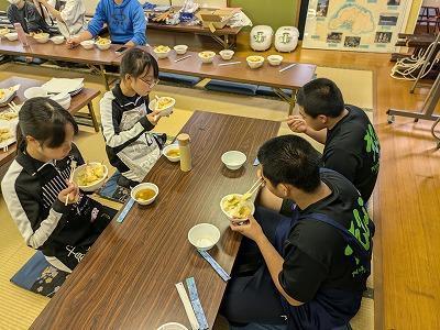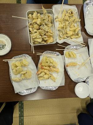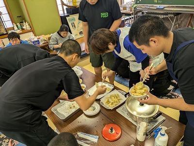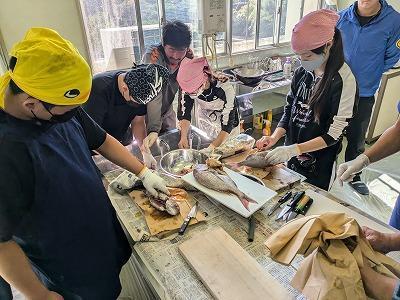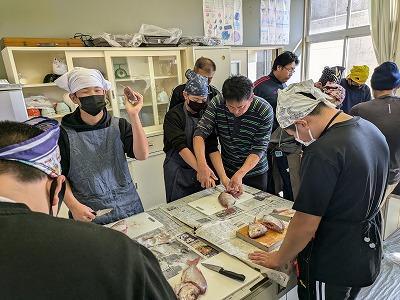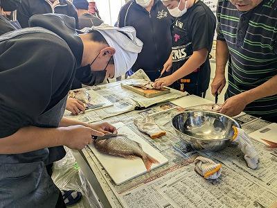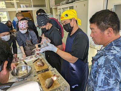 つぎ沼島の漁業の未来を担う若き漁師さん9名を講師に迎え、今年も立派な「タイ」を相手に魚捌き教室です。力自慢も多い生徒ですが、力任せではどうもうまくいかないようです。グニグニと押したり引いたりしてもうまくいきません。コツを伝授いただきだんだんとさばけるようになり、何とか給食に間に合いました。今日のメニューは「鯛、エビ、自家製サツマイモ、玉ねぎの天丼」「鯛のアラ味噌汁」でした。私もご相伴させてもらいました。大変おいしかったです。
