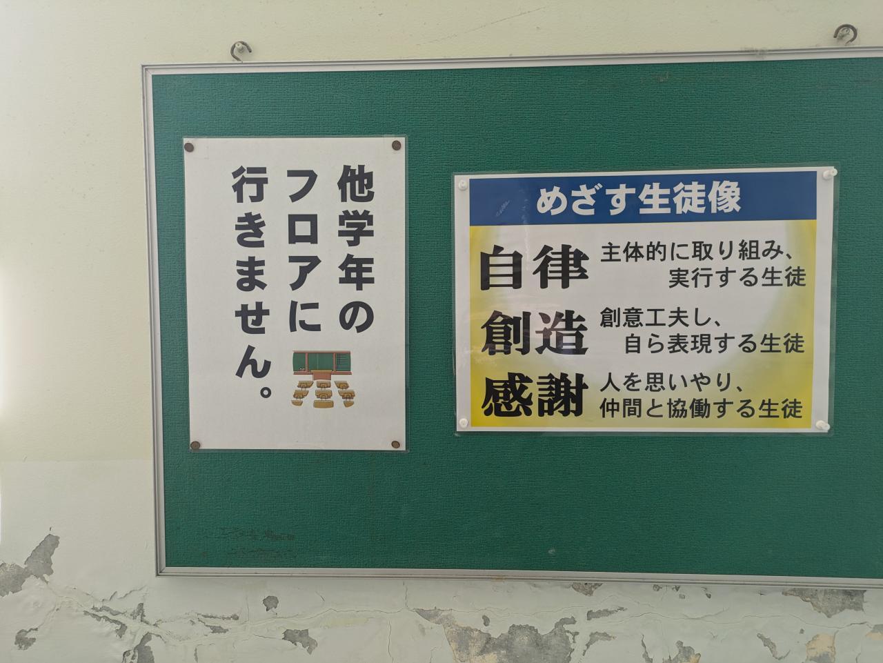 南淡中の1階と2階の階段の踊り場で見つけました。トラブル回避のためでしょうね…同じバスで同じ部屋で児童生徒が旅行できる沼島小中の素晴らしい子どもたちが誇らしいです✨