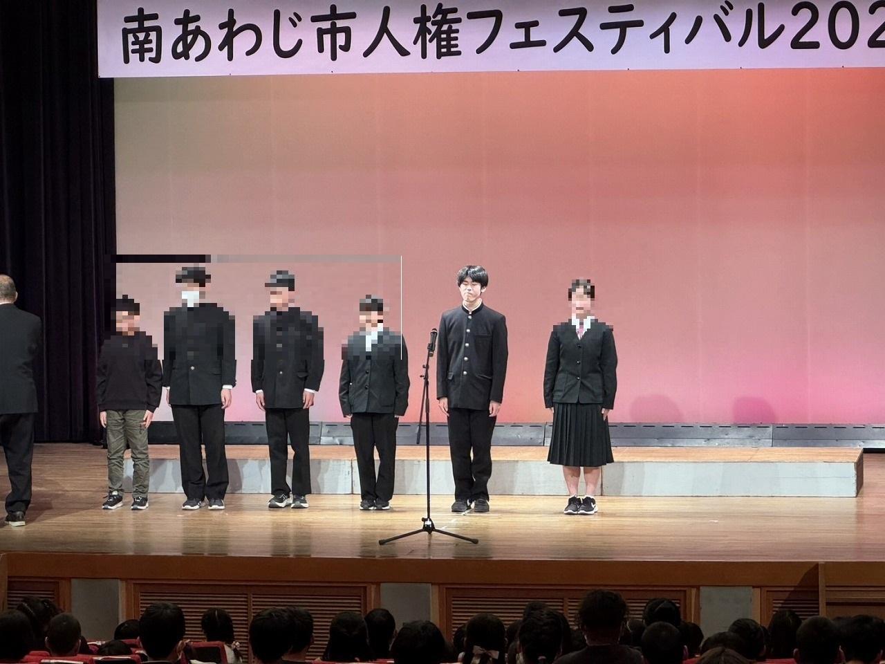 12/8 三原地区公民館大ホールで行われた南あわじ市人権フェスティバル2024で平田くんが代表受賞しました