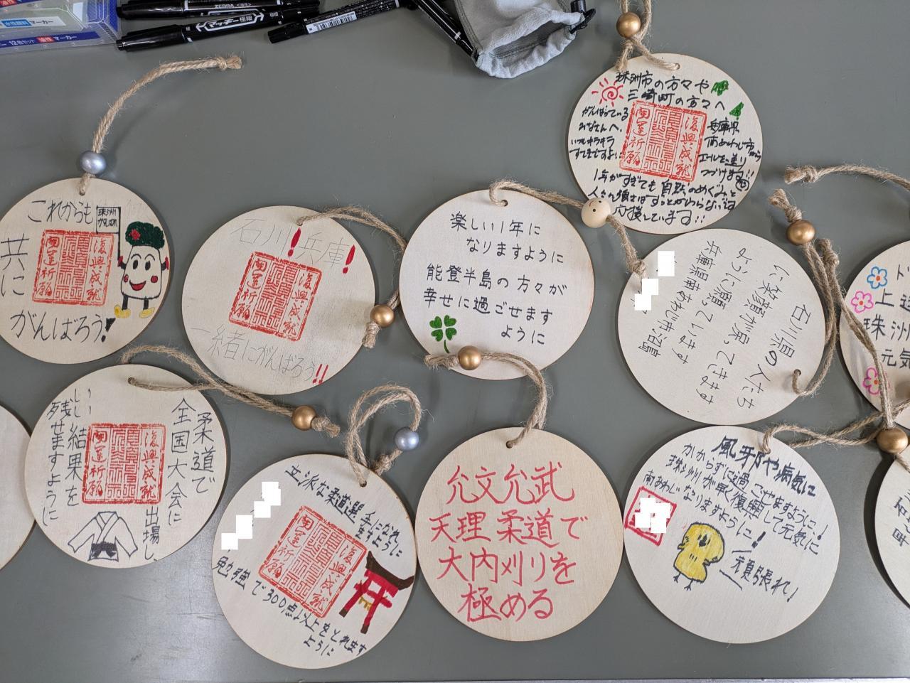 その後、みんなで須須神社で披露される復興激励メッセージを絵馬に書きました。まとめて猿女さんに送ります。