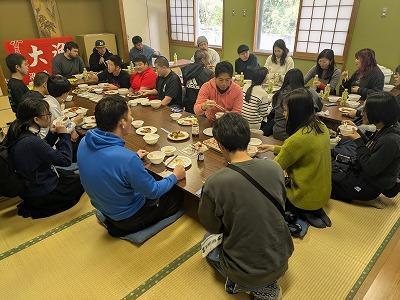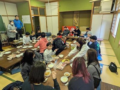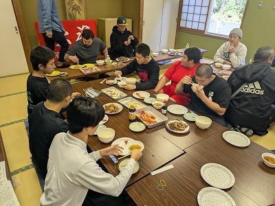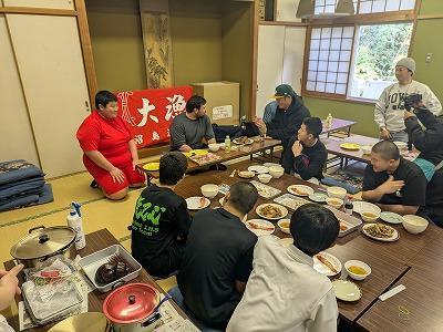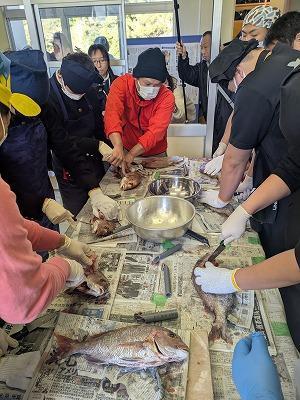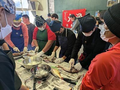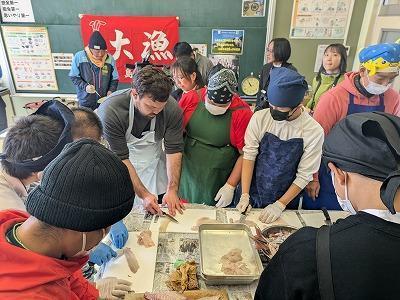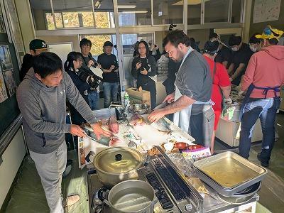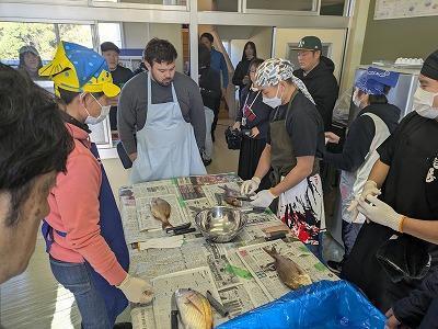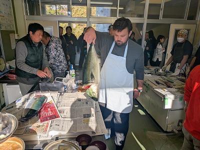 2020東京五輪柔道100kg級金メダリスト ウルフ・アロン が来島しました。本当に気さくな方で、沼島の第一歩が「ボケ」まくりだったようです。沼島中についてからもずっとその調子で参加した生徒、保護者、漁協の方々ともすぐに打ち解けて「ウルフの鯛捌き教室」がはじまりました。が、少し、内容が変わってウルフさんには「鰤(ぶり)」捌きに挑戦してもらいました。ウルフさんは、魚捌き、料理も上手でで魚捌きについては、漁師さんさながらです。you tube等でたくさん動画が上がっていますのでぜひご覧ください。そこで、せっかくの沼島だからと漁協青年部さんに相談したところ「ブリ」を提供してくれました。本当かどうかは別にして「一週間に1回は魚をさばいています」という言葉のとおり、見事な腕前でした。沼島漁協青年部さんには準備から、魚捌き教室、料理まで本当にお世話になりました。そのうえ、子どもたちの様子を見に来ていた保護者さんに「ぜひ、子どもたちと一緒に食べたって」と自分たちの分の料理を提供してくれました。テーブルは別になりましたが、「思わぬ親子会食」となりました。