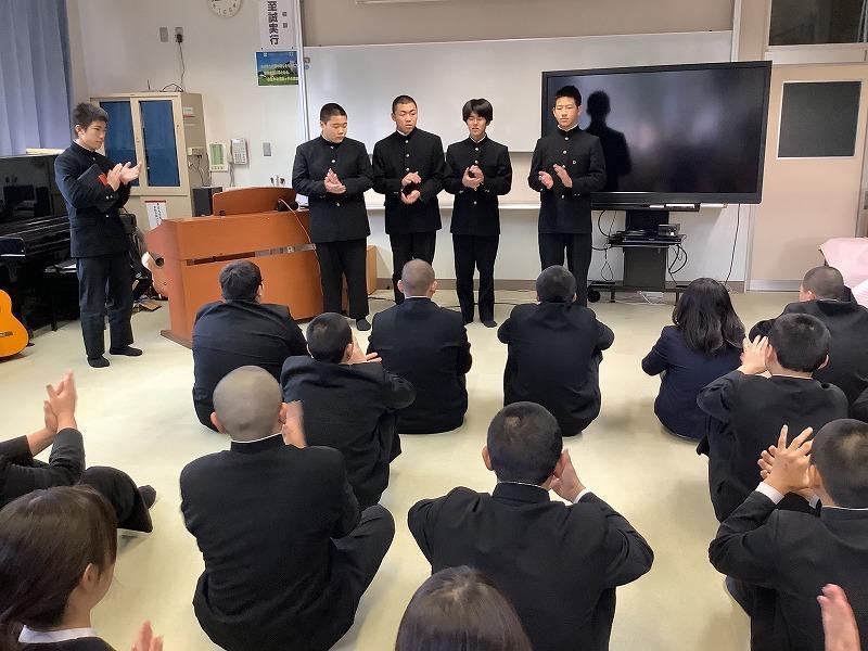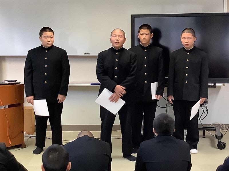 清水くんは、生徒会長の大役に緊張しながらも「やってやるぞ」という気持ち溢れる決意表明でした。東くんは「生徒会長になりたかったけど」と高い志を示すとともに、気持ちを切り替えてがんばるぞという意欲が見られました。角地くんは、選挙となりその中で選ばれた責任をしっかりと受け止め他の子の分も頑張るぞと決意しました。小林くんは、自らの選挙公約にふれ「楽しい学校づくり」の先頭になることを誓いました。それぞれの持ち味を感じさせられる着任挨拶でした。主体的、活動的な生徒自治活動をお願いします。