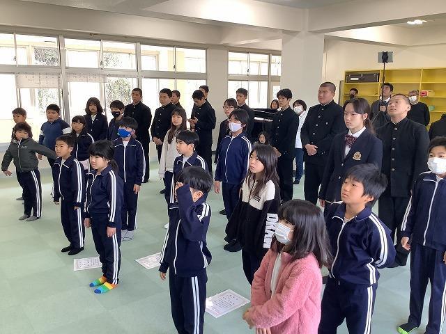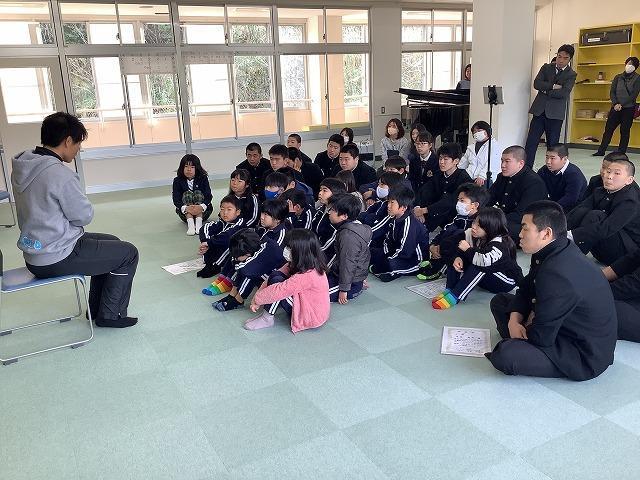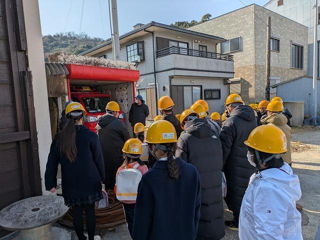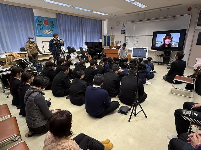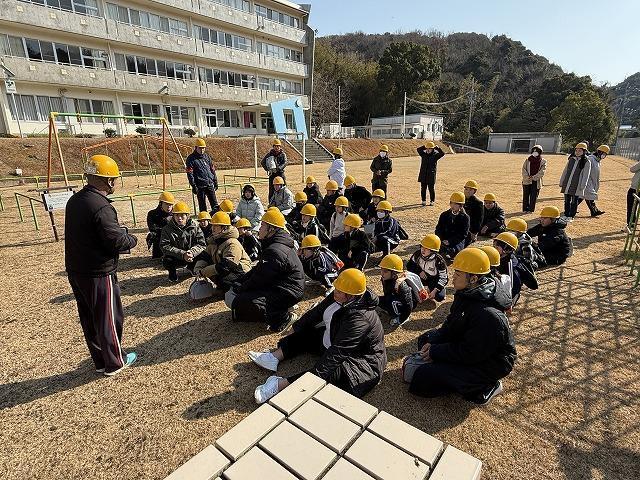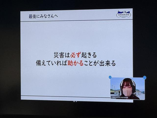 して、岩手県釜石市の命をつなぐ未来館と沼島中学校をつないで防災学習をしました。講師は東日本大震災の時に当時中学2年生釜石市鵜住居町で被災した川崎杏樹さんです。川崎さんは、今「命をつなぐ未来館」のスタッフとして、自ら経験した震災、津波体験をもとに活動されています。川崎さんが住む鵜住居町には、10m超の津波が襲いました。当時の様子を避難経路に沿ってお話してくれました。その避難する中で「保育園の子をおぶって避難する生徒」「老人を励ましながら手を引いて避難する生徒」など小中学生が率先して避難し、自分の命を守るとともに地域の方々の命を守ったエピソードも紹介してくれました。秋に総合センターでお話いただいた斎藤幸男先生の話にも、避難所で活躍する高校生の話をされていました。沼島では、今回のように地域と小中学校が合同で避難訓練をしています。特に中学生は、自分の命をしっかり守った上で地域の若き力として「助けられる人から助ける人へ」となってほしいと思います。(能登半島地震及び豪雨被害支援活動と合わせて、地域としっかりと連携した防災が評価され「ぼうさい甲子園」でレジリエンス賞をいただいています)