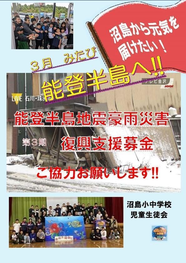つきましては、少しでも被災地支援になればと考え沼島小中学校児童生徒会では、第3期能登半島地震・豪雨災害支援募金活動に取り組みます。第1期、第2期と保護者様を始め地域の方々、活動に賛同していただいた方々より多くの募金を預かり能登半島へ届けてまいりました。再度のお願いとなりますが支援していただくようお願いします。