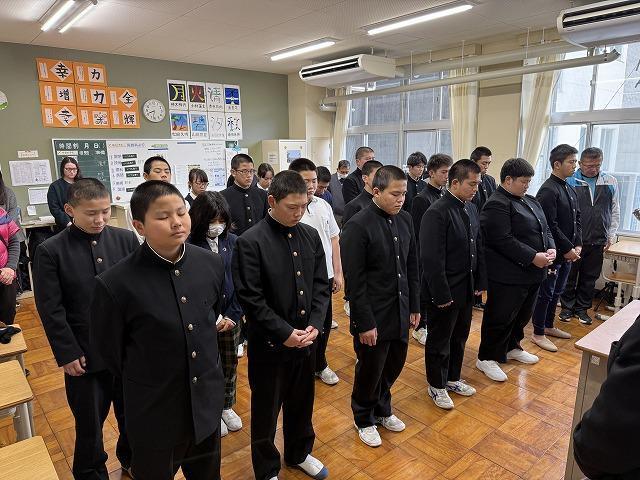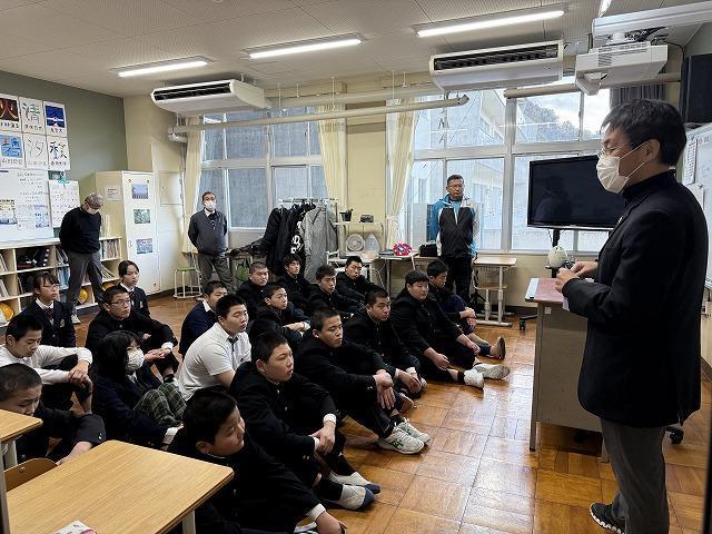 「沼島から元気を届けたい!!」として昨年3月に沼島小中学校児童生徒会の活動の代表として中学生が柔道の被災地交流練習会に合わせて金沢市役所に募金を届けました。今年も柔道部は3月最終週の全国大会の帰りに北陸へ向かい、被災した中学生等と被災地交流柔道練習会を実施する予定です。その機会に昨年も被害状況を視察させていただいた内灘町をはじめ能登半島の今を、復旧復興の様子を生徒たちに見てきてもらい沼島の小中学生にしっかりと伝えてほしいと思っています。