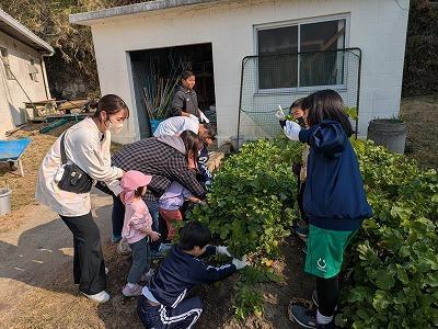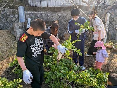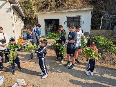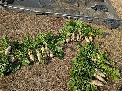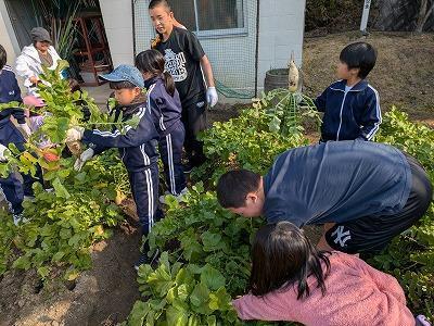昨日、中学生が夏野菜の後に種まきした大根を保育園、小学1年生2年生を橿本農園に招待して、大根収穫大作戦を実行しました。2~3週間前に、中学生は自分が食す分をプレ収穫祭としてひとり2~3本ずつ引いて持って帰りました。しかし、それでも、まだまだ、抜きがいのある本数が残っています。中学1年生の指導?のもと、保育園、小学校のお友達は次々と大根を引っこ抜いていきました。大きい大根が抜けたら「デカ!」という声や葉っぱだけで意外とちっちゃい大根だったら「えっ?」・・・とポカポカと温かい陽ざしのもと、楽しいひと時を過ごすことができました。
