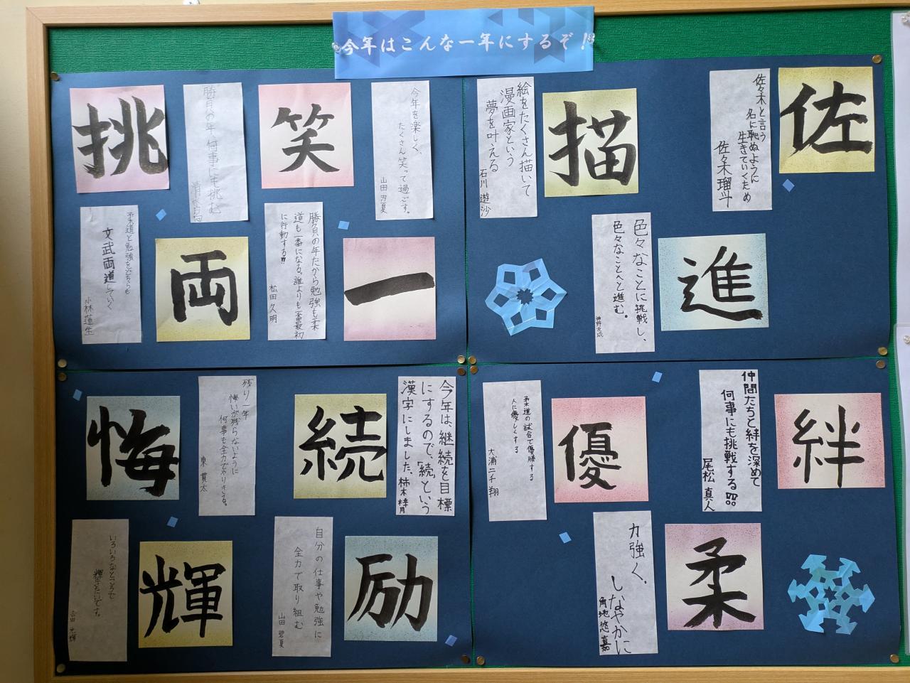 寒暖の差が激しいからか、休みも多く今日は久しぶりに全員登校できました。「一文字に誓う!!」も1年、2年生分が出そろったので紹介します(3年生は、書初めの間、学力テストをしていました。しかし、自らの進路を切り拓くために心に強い決意を秘めていると想像します)