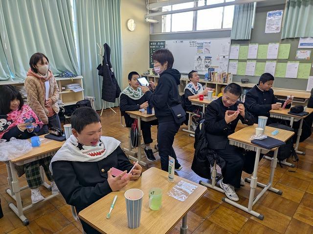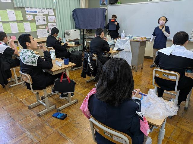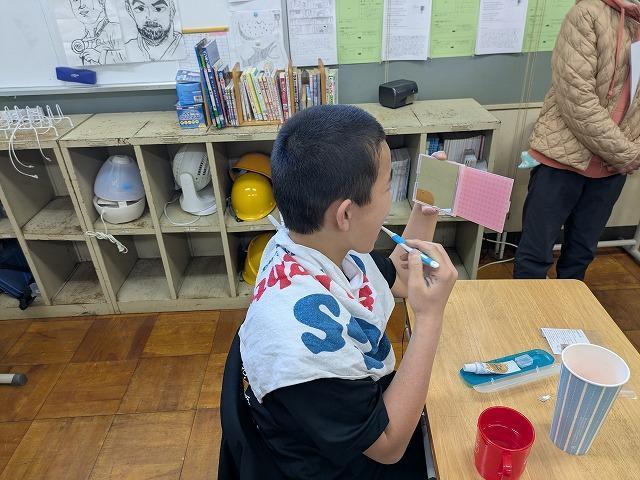「沼島の子、虫歯は少ないけど磨き方が悪いのかプラークが・・・」学校歯科医の櫻木先生と歯科衛生士さんが「中学生歯磨き教室」を開いてくれました。プラーク(歯垢のことです。)は細菌のかたまりで、放っておくとむし歯や歯周病を引き起こします。実際に、プラークを専用の錠剤で赤く染色してみると・・・みんなの歯は真っピンクに染めあがりました(舌もピンク。りんご飴を食べたときと同じです)。自分の磨き残しを鏡を見ながらブラッシングしていました。毎日の歯磨きの時、意識して磨けるようになるでしょうね。歯は一生ものです(職員室では○○先生が2日に1回は歯の悩み、困りごとをつぶやいています・・・)「柔道部の生徒はどうしても歯を食いしばることが多いのか、歯のすり減り方がやはり同年代の子と比べると激しいですねぇ」ともおっしゃってましたよ。