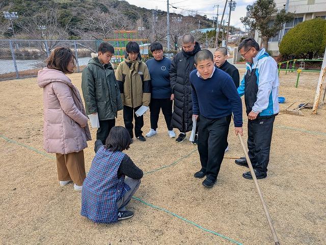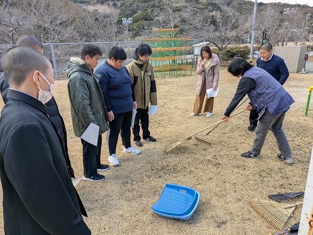 若草山(奈良県)の山焼きが有名です。古い萱・ススキ・芝を焼き払うことで新しい芽の成長を促す効果があります。 沼島小中学校が誇る芝生グラウンドも春の青々とした芽吹きのために焼いてしまおう!! とできれば豪快ですがそうはいきません。そこで芝生の枯れた部分を徹底的に取り払う枯草掃討作戦(なんか最近○○作戦が多い気が・・)が2/3に実行されます。今日は、縦割り班長に枯草師匠から匠の技が伝授されました。