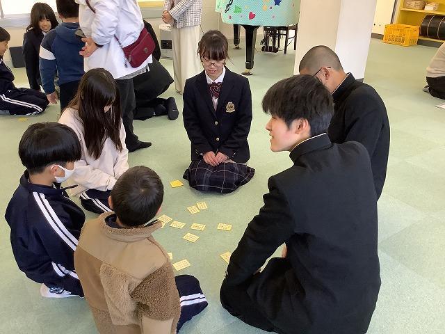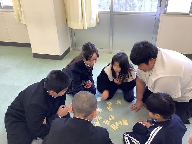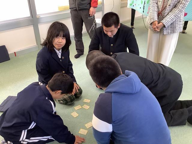 児童生徒集会があり縦割り班で五色百人一首大会です。今回は黄色です。五色百人一首って取り札の裏に、百人一首が書かれているのですね。知っている人は、並べた段階でチラリと予習?準備?していました。