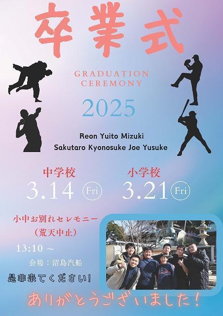 そんな3/14の卒業式の日3/14で3年生は沼島中を巣立っていきます。今年の3年生は沼島小学校のお友達と「まる3年間」お隣の校舎で一つのグラウンドで過ごしました。体育祭、学習発表会、春の遠足・・・そして、能登での支援活動一緒にそれぞれの役割を果たしながら過ごしてきました。そんな児童生徒の別れのセレモニーを始めて沼島汽船場で行います。それに向けて主役である沼島小中9年生の最上級生がポスターを作りましたので紹介していきます。沼島の方々への呼びかけとして地区の掲示板等にも掲示しています。