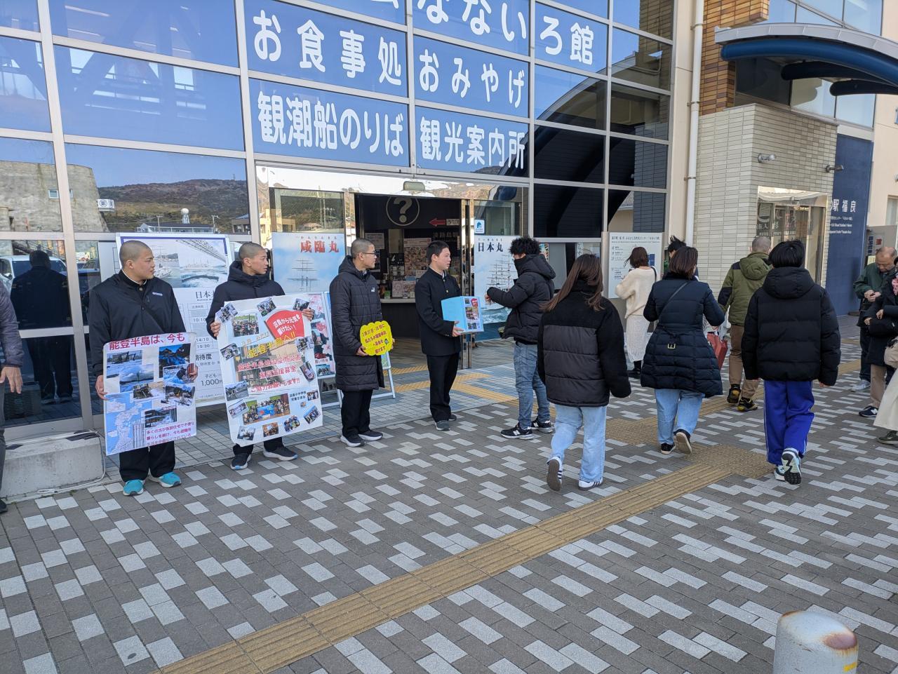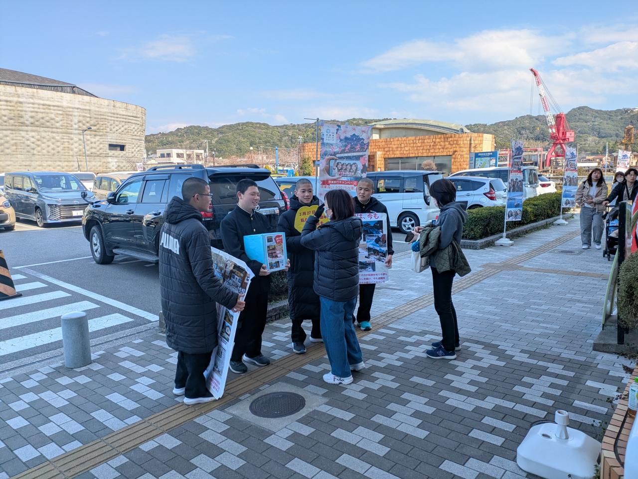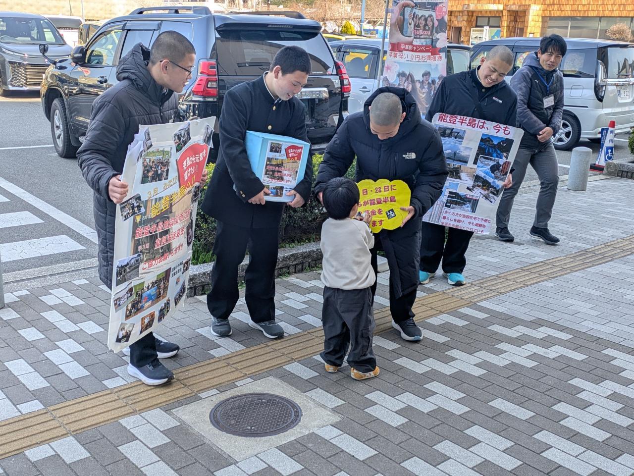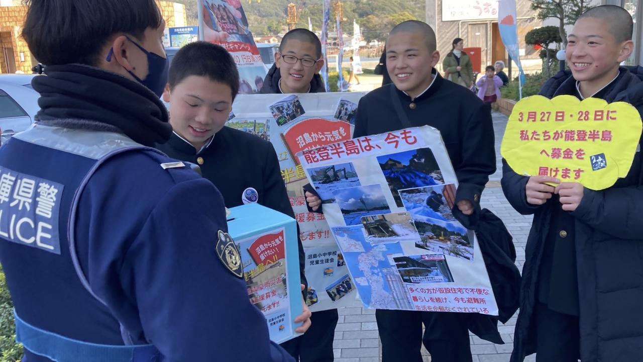 春の大潮、鳴門の渦が大きくなる観潮の絶好のシーズンです。多くの観光客で賑わう福良なないろ館前で「募金お願いしまーす」「来週、能登半島へ届けにいきまーす」と大きな声で4名の2年生が募金を呼びかけました。「がんばってくださいね。」とその大きな声、元気な声にみんな笑顔で募金に協力してくれました。ありがとうございます。ある男性がやってきて「私、石川からきています。募金活動ありがとうございます」と声をかけてくれました。「来週、石川県に行きます。内灘町に募金を届けます」とお知らせすると「私、その内灘町から来ました」なんというご縁でしょう。募金活動に励むキミたちの姿を見て、募金以上に力付け、励ますことができたのではないでしょうか。