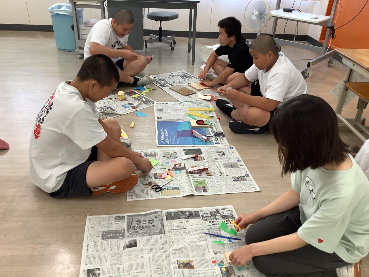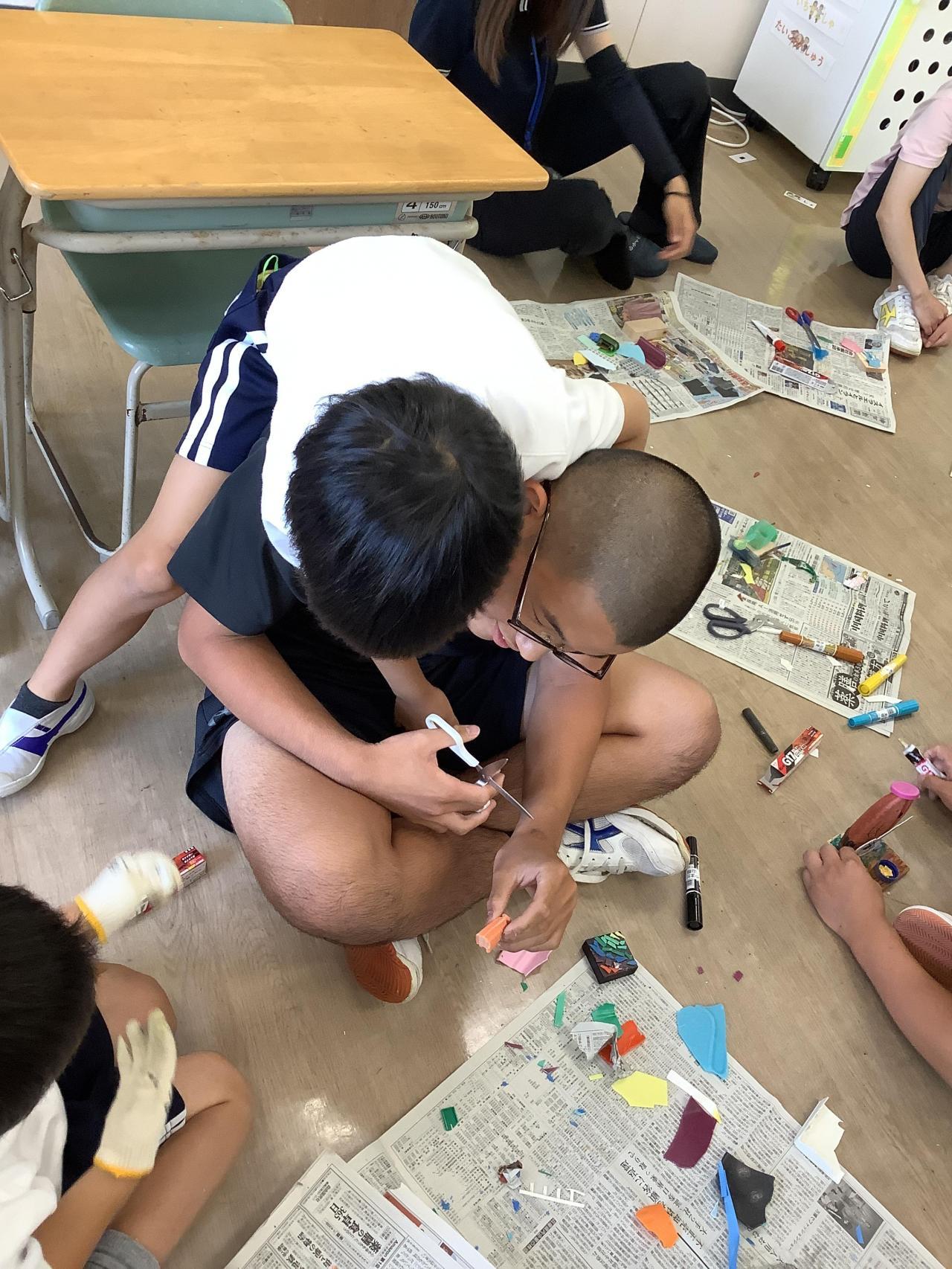 石川県珠洲市より、昨年度お世話になった竹下あづささんに来ていただきました。6月にPTAのみなさんと一緒に拾った海水浴場のごみをきれいに洗い、漂白して材料にします。土台となる板材は、3年生の清水さんからいただきました。ありがとうございました。地域おこし協力隊のの長坂さんも来てくださいました。
