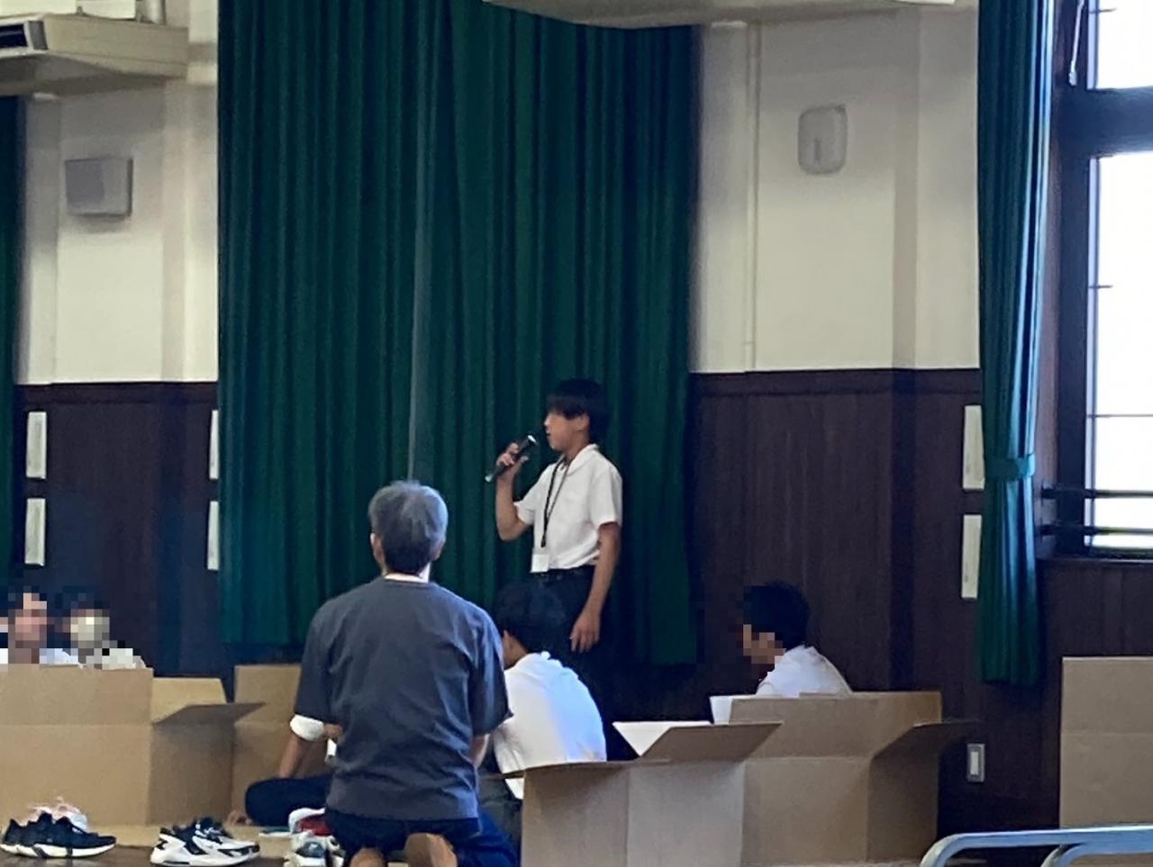 中1悠輔さんは全体発表の中で真っ先に手をあげ、避難所での勉強の課題と解決策について大きな声ではきはきと発表できました。