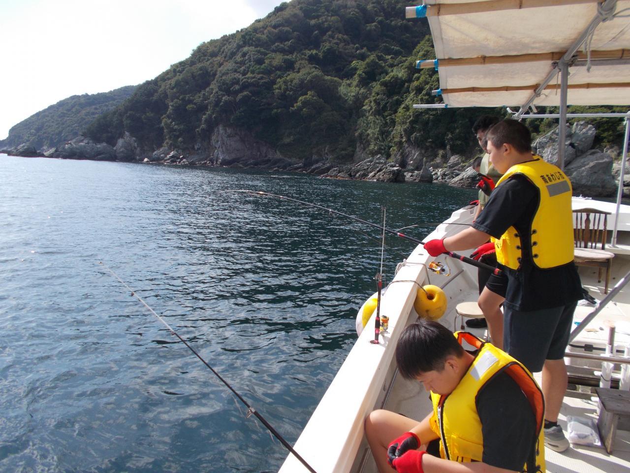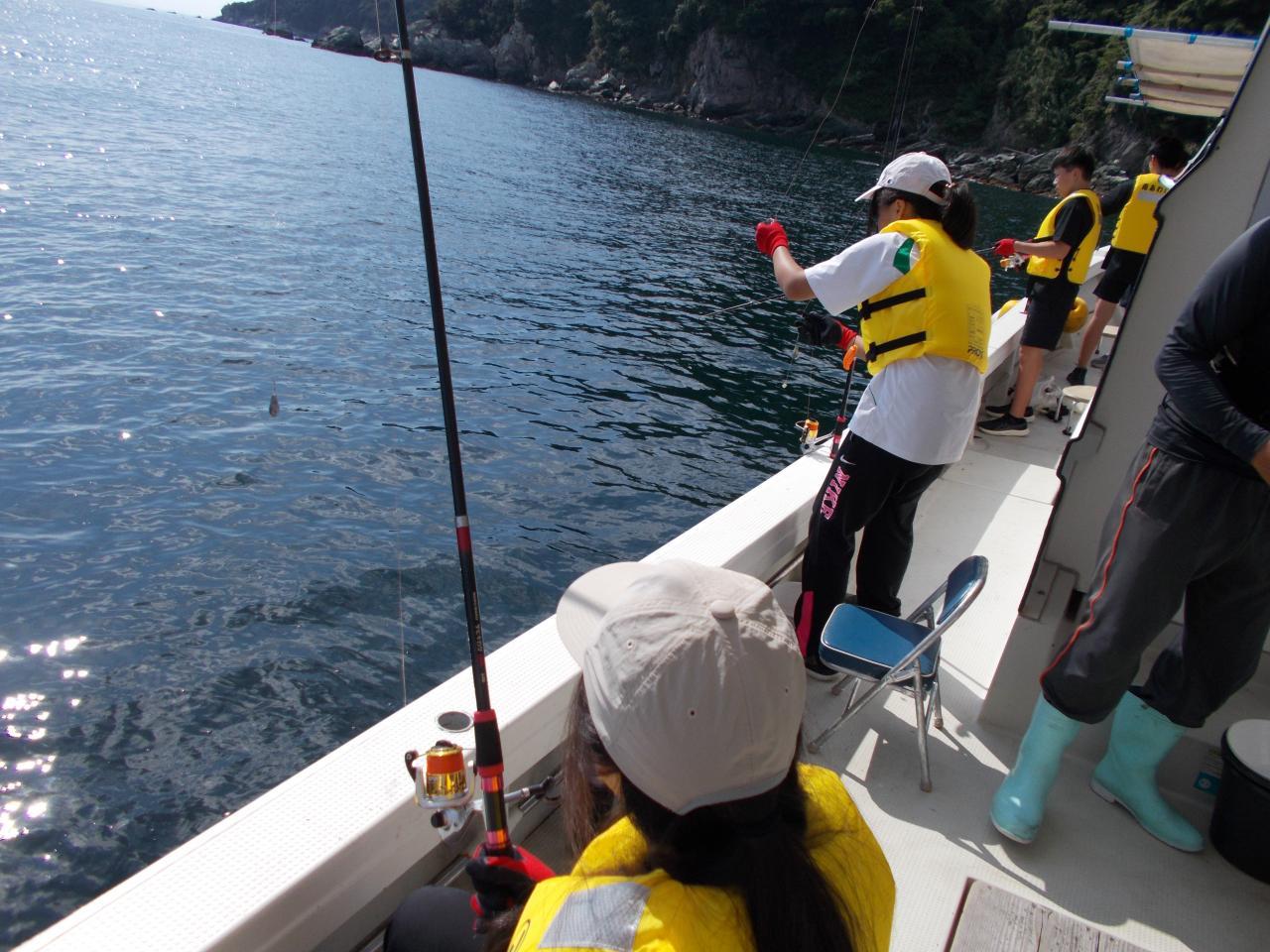 泊区自治会長 石井正幸様の釣り船を出していただき、貴重な船釣り体験をさせていただきました。初めはこわごわ釣り糸を垂れていた初心者の生徒たちも、すぐにコツをつかんで釣りを楽しみ始めました。足下で跳ねる生きた魚を見たのは初めてだそうです。釣り好きの生徒はもちろん「合わせにいく」と専門用語?を発しつつ、かっこよく釣っていました。9人全員が20匹前後は釣れたようで、3時間があっという間でした。とても楽しい体験となりました。