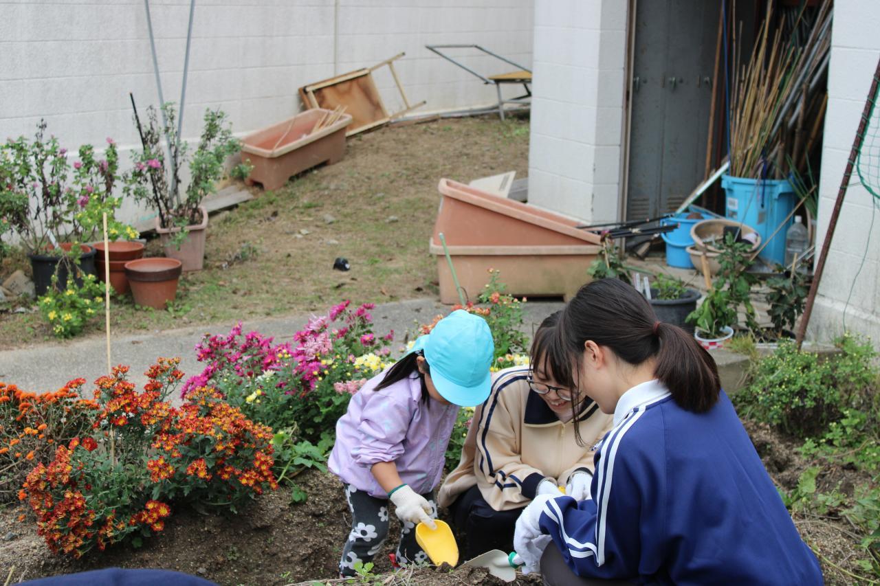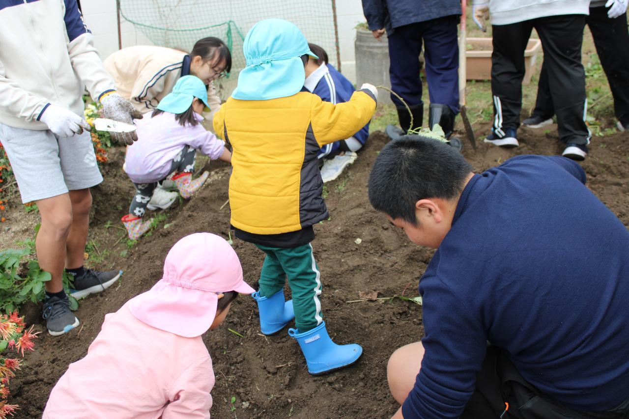 園児たちの愛らしい笑顔にいやされながら、3年生も芋掘りを楽しみました。