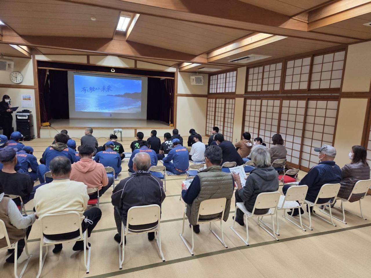 避難訓練後は、沼島総合センターで地域の方々と一緒に、映画「有り、触れた、未来」を観賞しました。何年たっても癒えることのない傷を抱えた人々が、そばに居る人と手をつなぐことでなんとか立ち上がり、未来へと歩き出す物語。「生かされて生きる」。とても感動的な映画だったと聞きました。