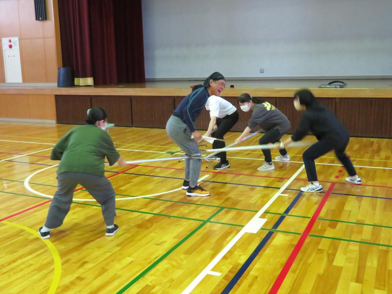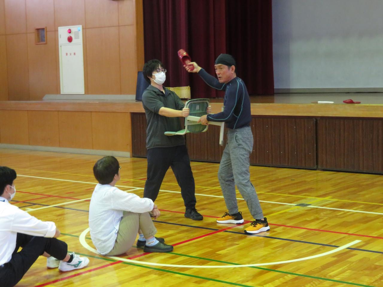 そんな1日、時間を有効に活用しようということで、先生たちは子どものいない学校で不審者がやって来たときを想定して、「さすまた」や「椅子」を使った訓練を行いました。たとえ不審者に力でかなわなくても、どこを狙えば効果的か練習しました。