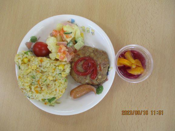 給食は、カエル(チャーハン)、かたつむり(ハンバーグ・ウインナー)、あじさい(マセドアンサラダ)、ぶどうゼリー…と、雨の季節にピッタリの誕生会ランチでした。🐸🐌