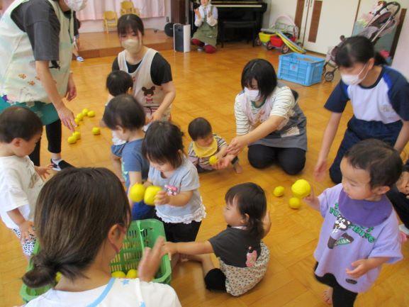 0、1歳児のお友達は玉ねぎ入れゲーム。たくさんの玉ねぎをコンテナに入れました♪