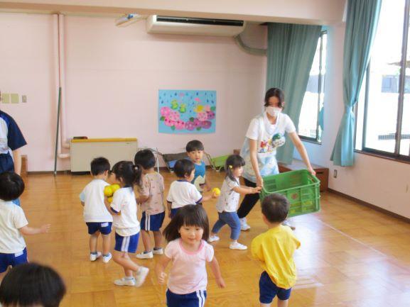 2歳児のお友達は、追いかけ玉ねぎ入れゲーム。