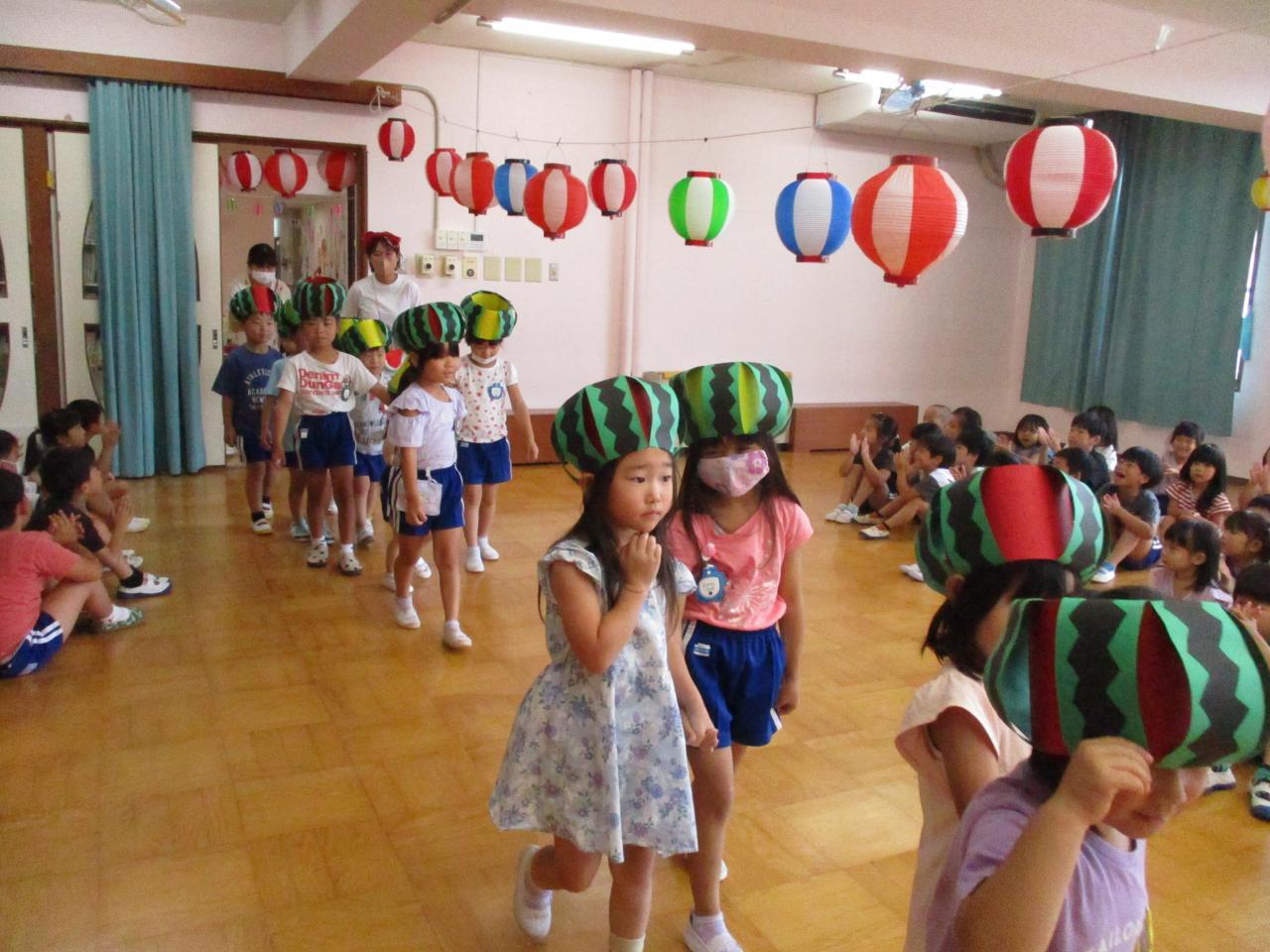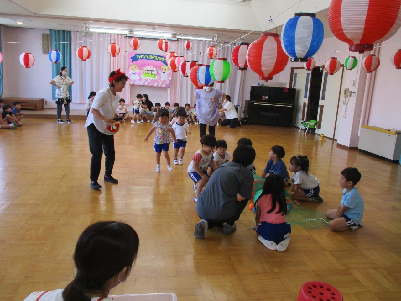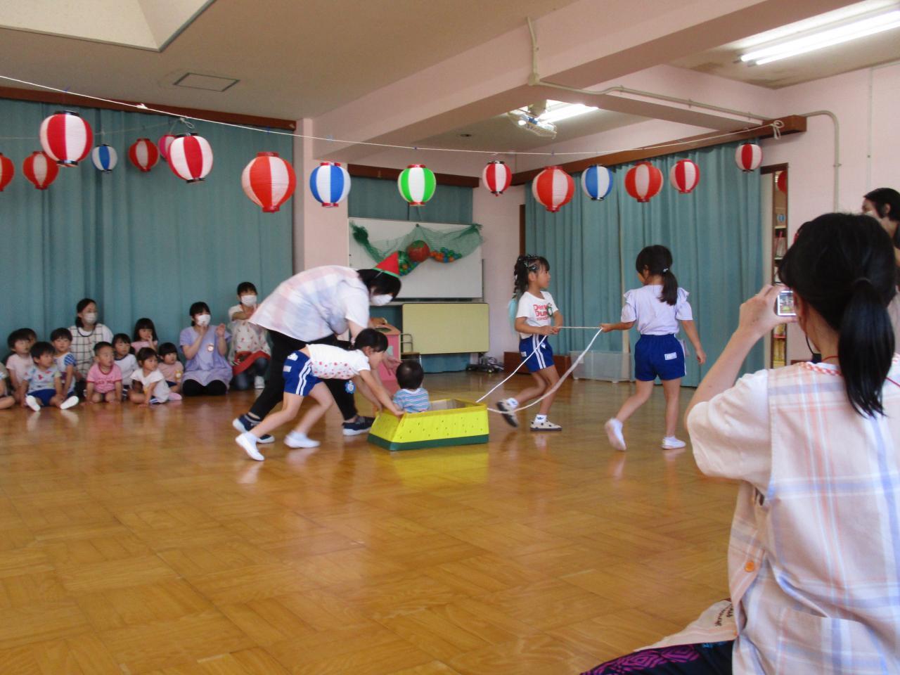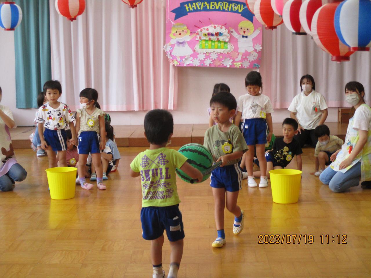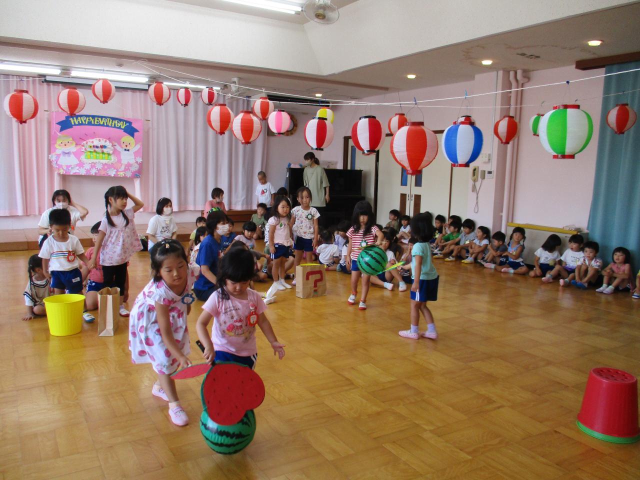 3・5歳児のお友達はうちわを使ってすいか運びゲームをしました。