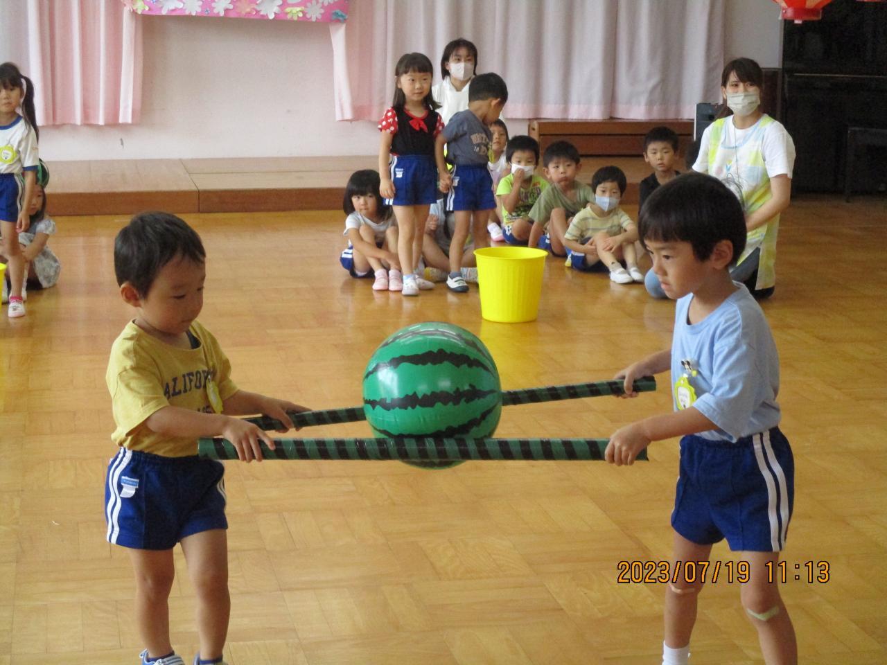 4歳児のお友達はすいか棒を使ってすいか運びゲームをしたよ!