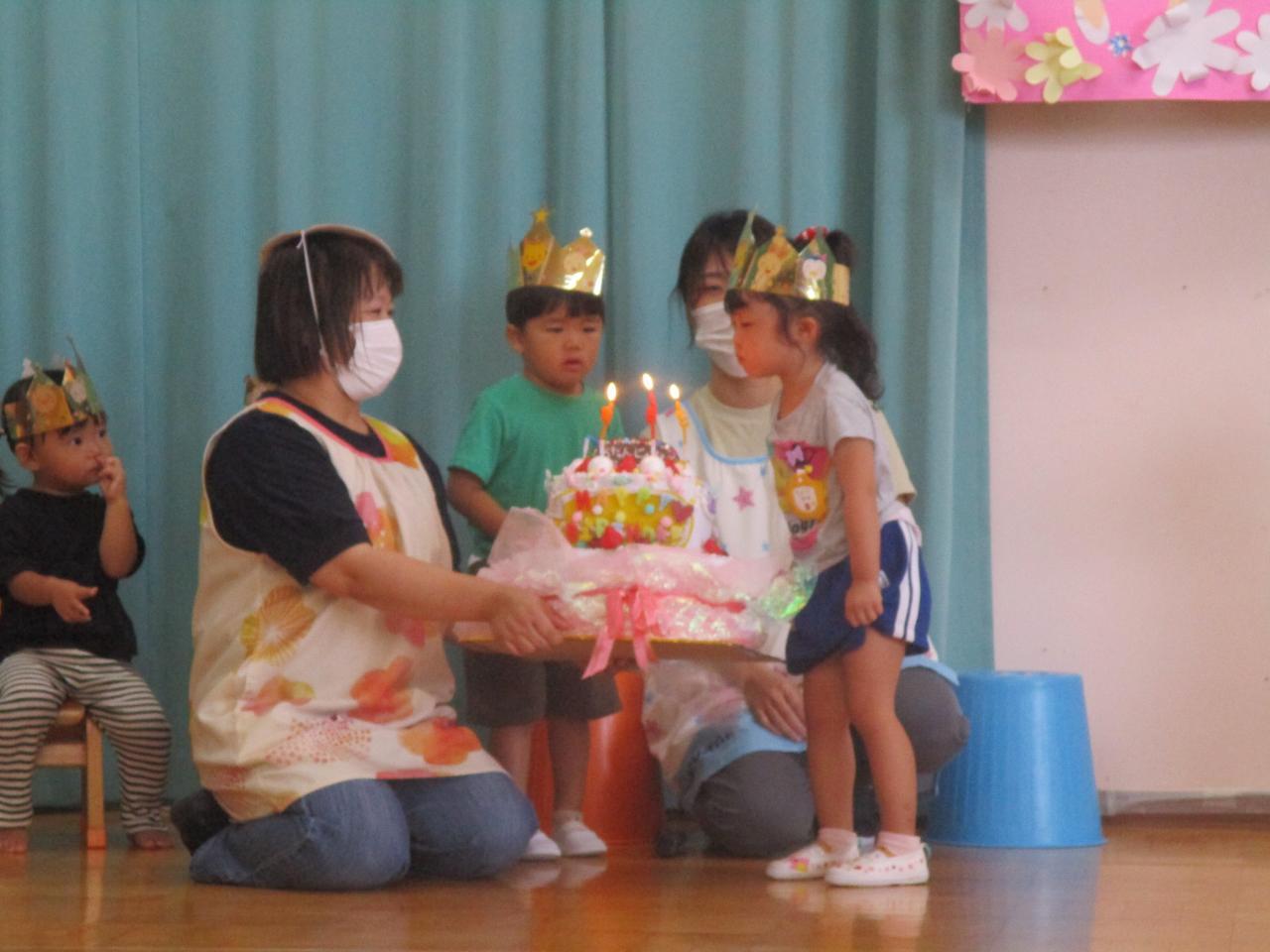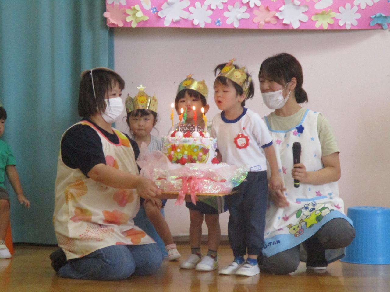 今月も、はなさきよさんがお祝いに駆けつけてくれたよ。ろうそくを吹く二人の息もピッタリ!