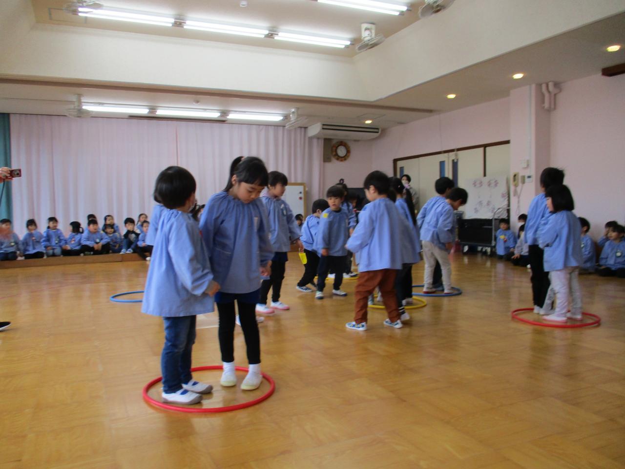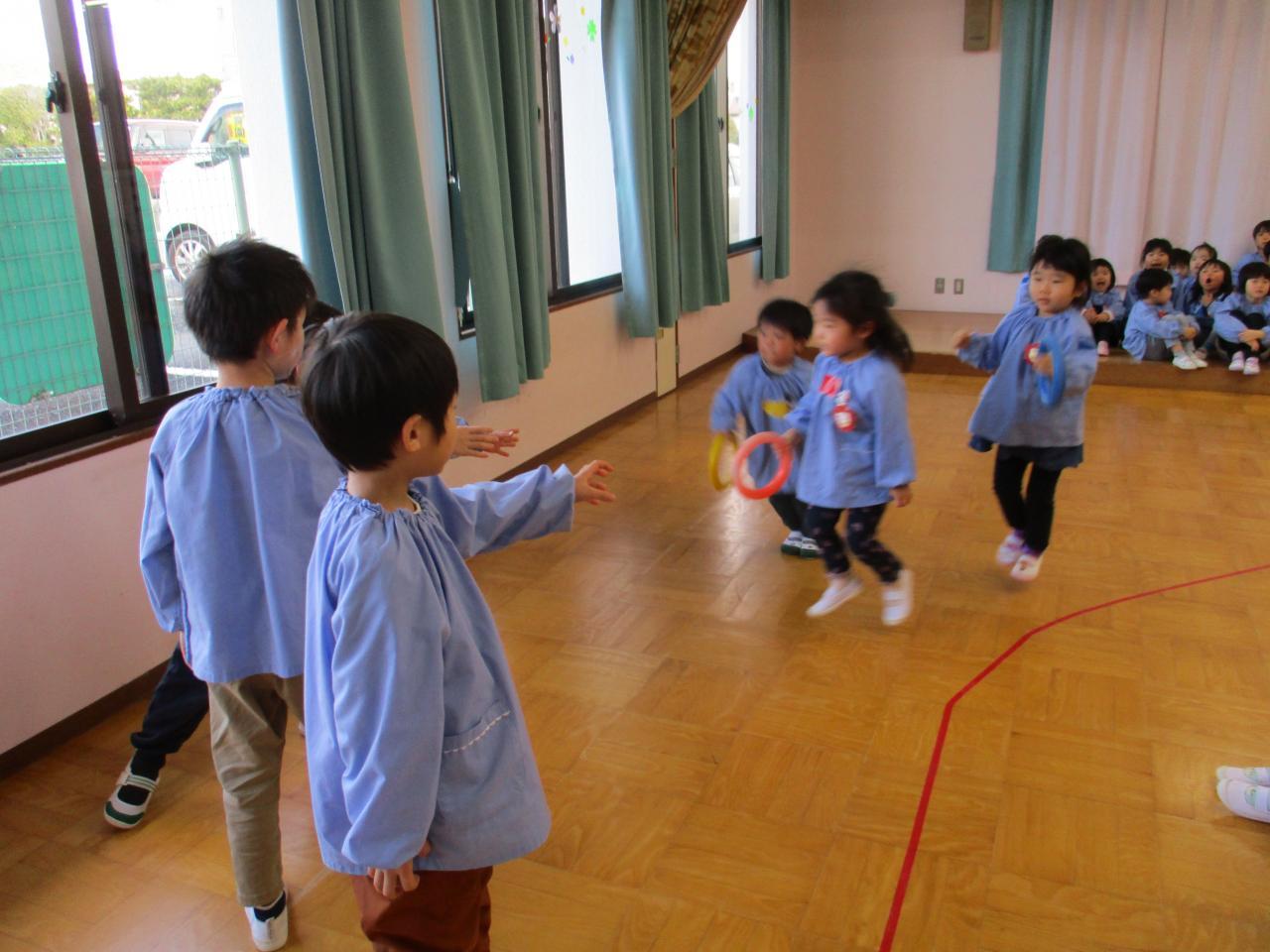 5歳児はスキップで1周。3歳児は両足とびで半周。バトンリレー☆彡