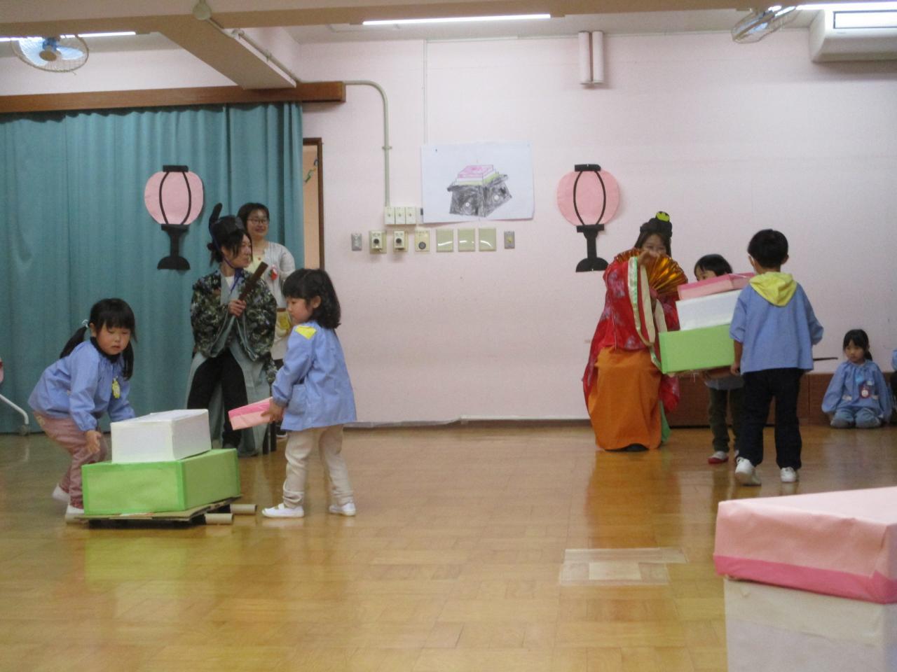 3、4、5歳児はお内裏様お雛様をぐるっと回って、友だちと力を合わせて3段ひしもち運びリレーをしましたよ。