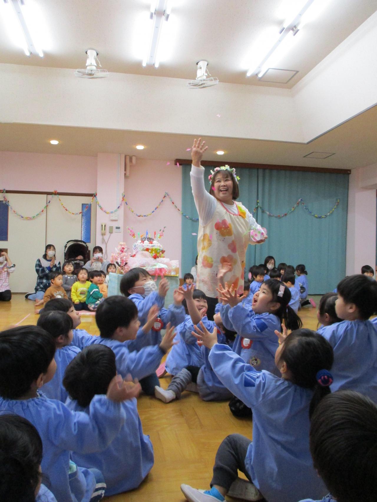 1月、2月の誕生会で参加できなかった友だちも含めて、17名の誕生児をみんなでお祝いしましたよ。