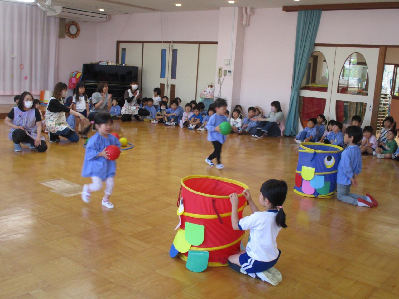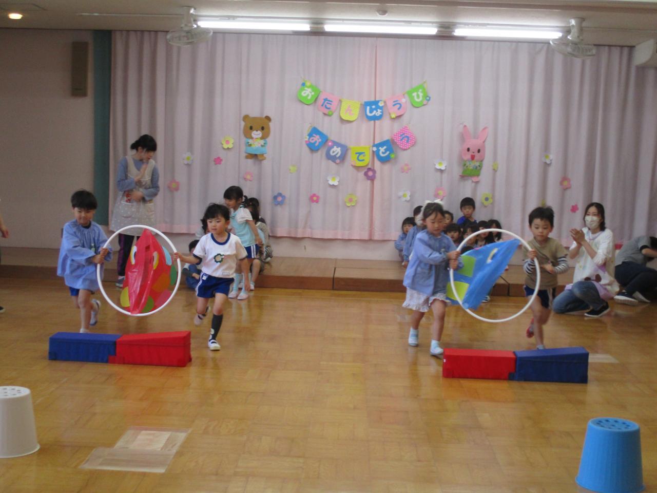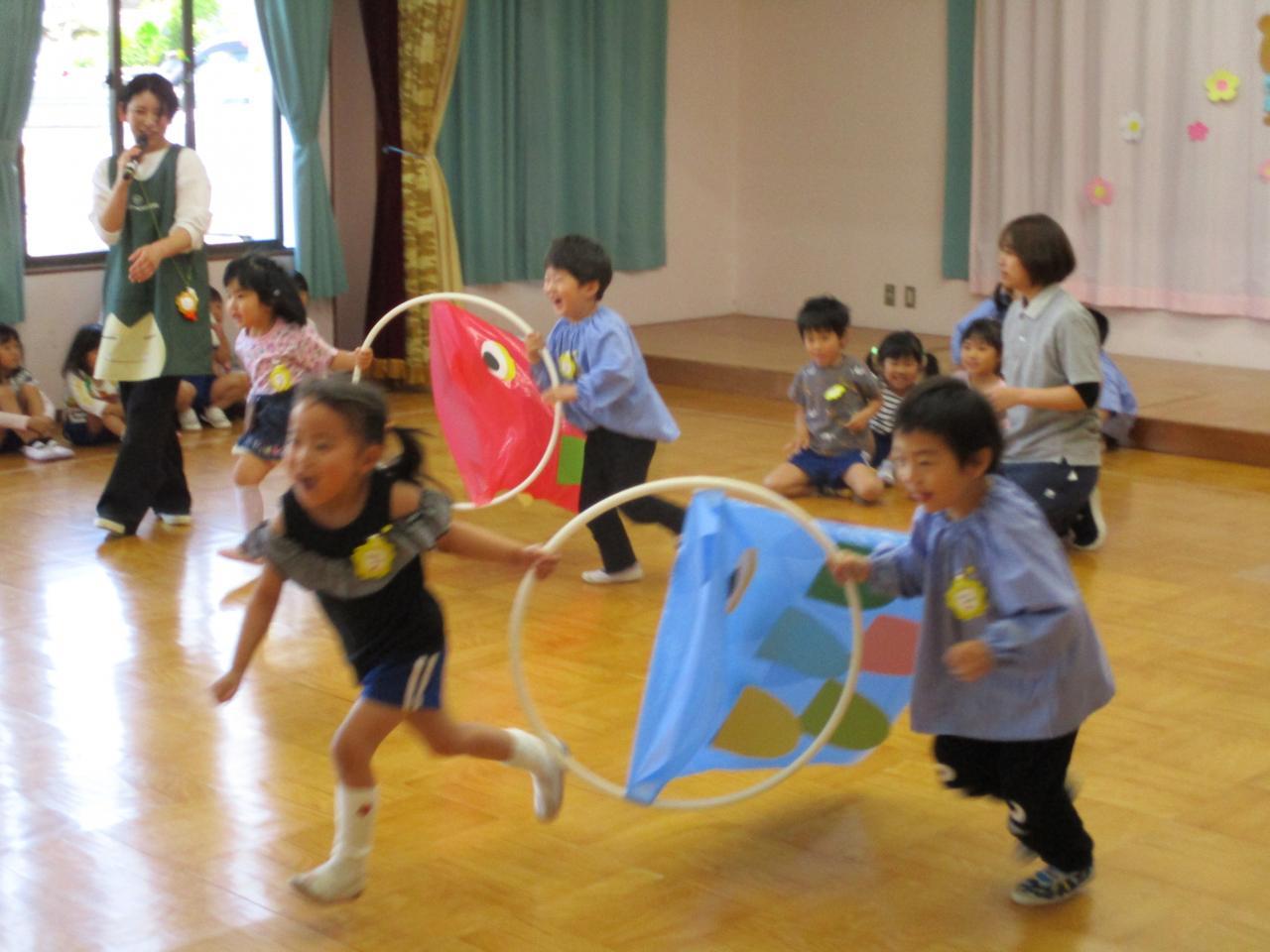 ぱんだ、きりん組さんは、こいのぼりリレー。