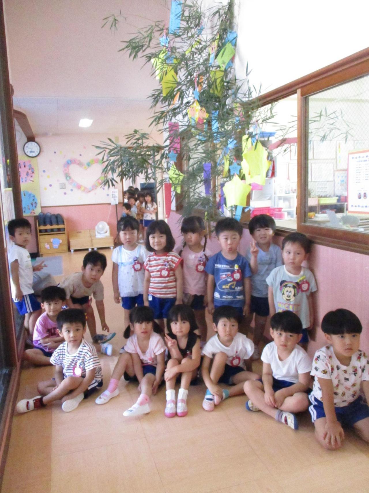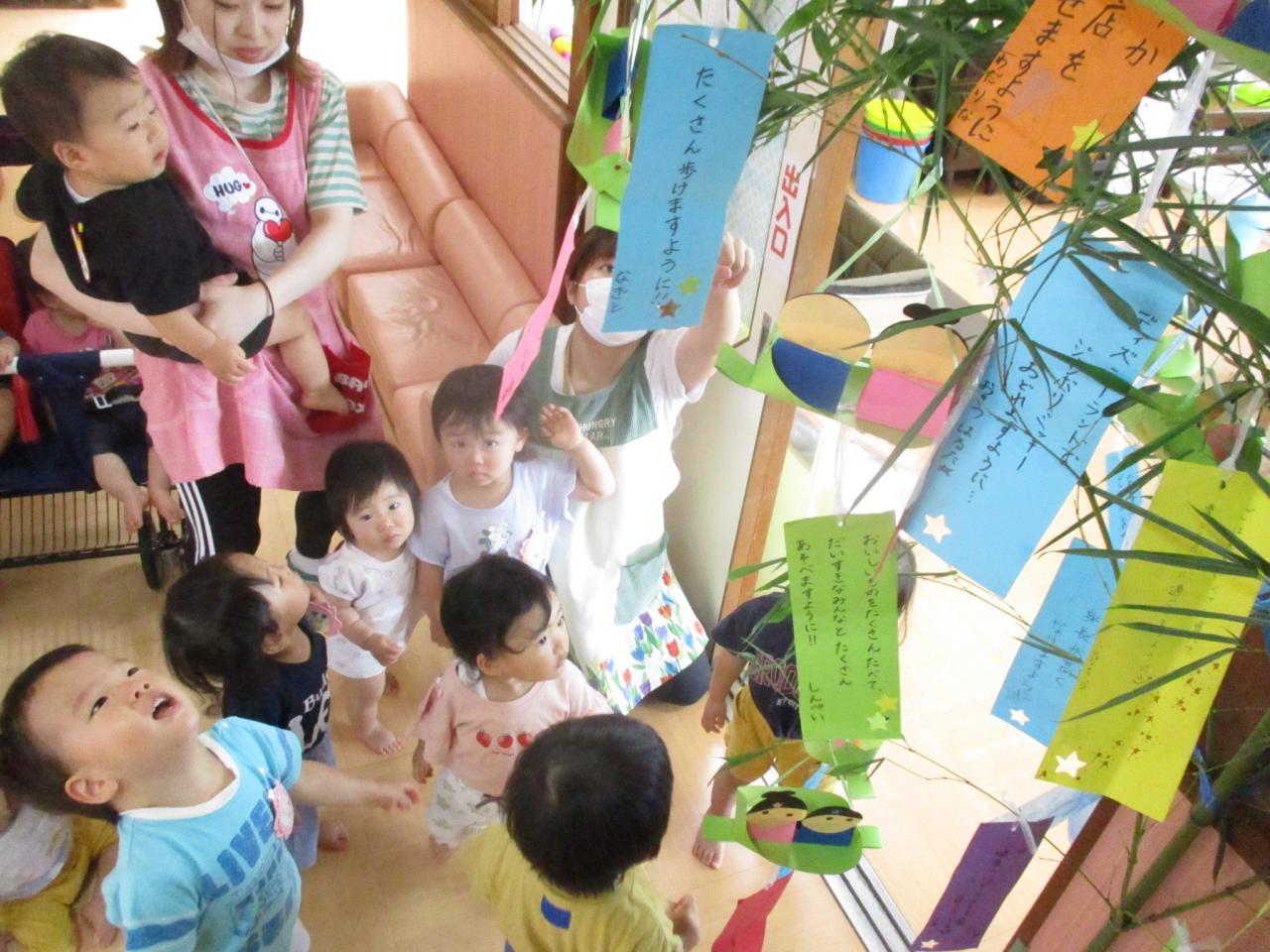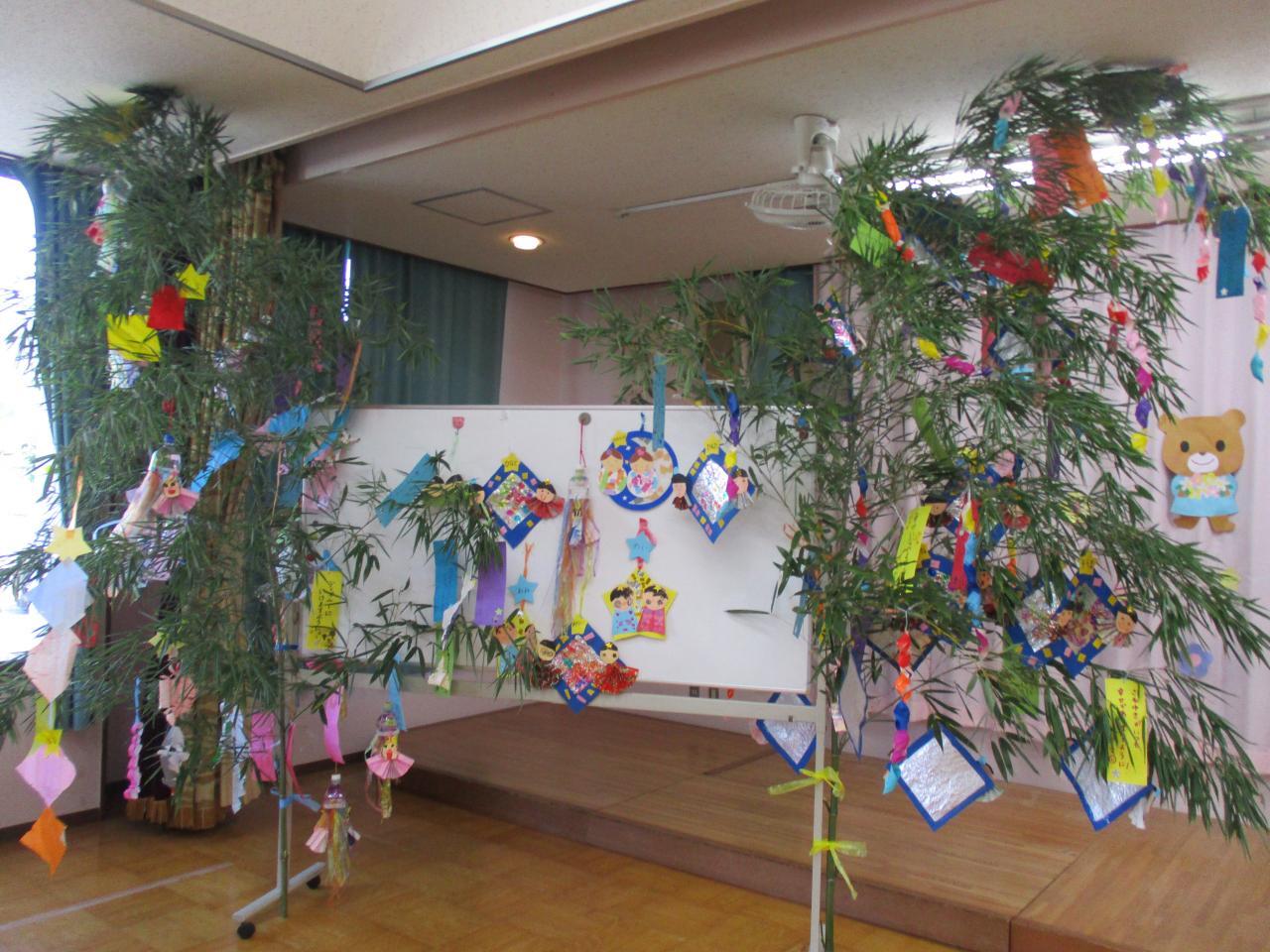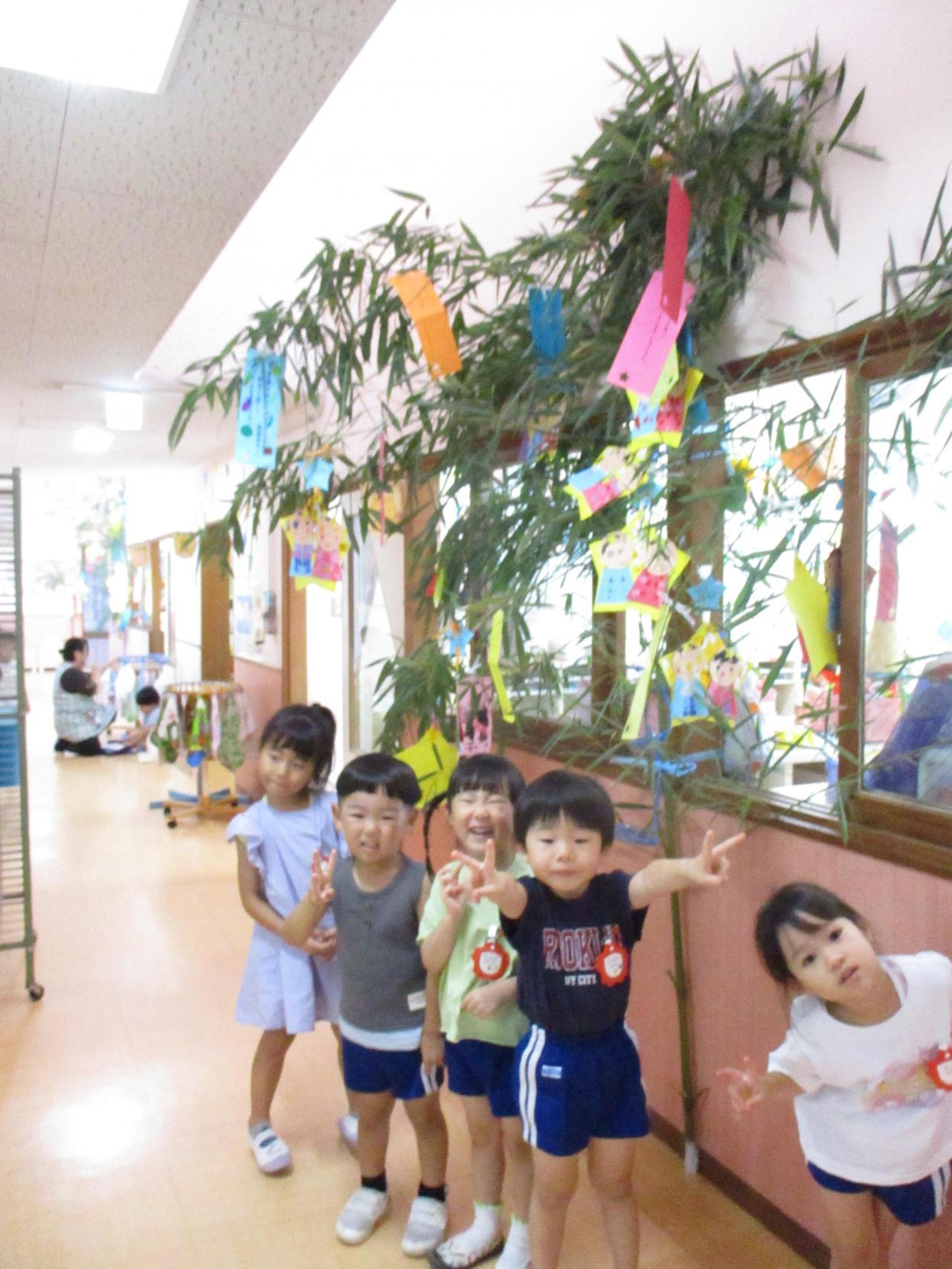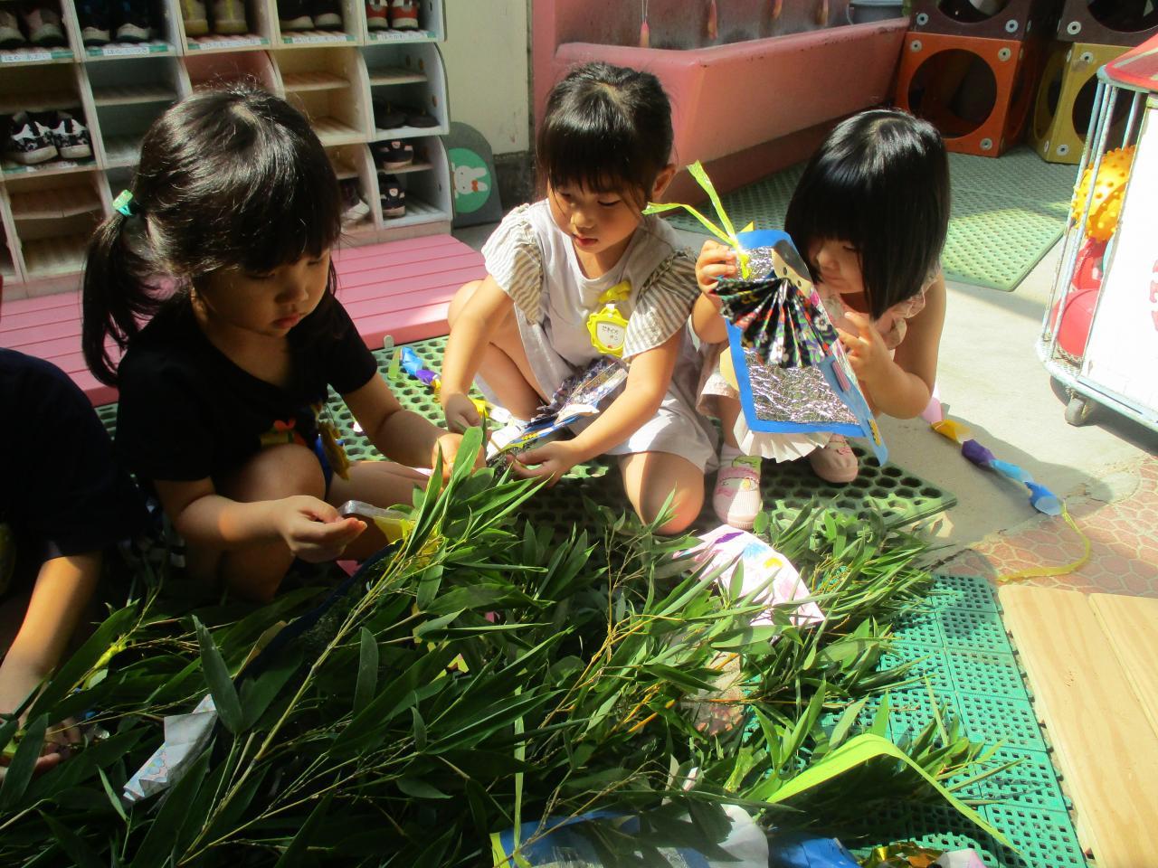 各クラスに1本ずつの笹があり、朝登園してきたお友達から、自分たちが作った笹飾りや短冊を笹に付けました。