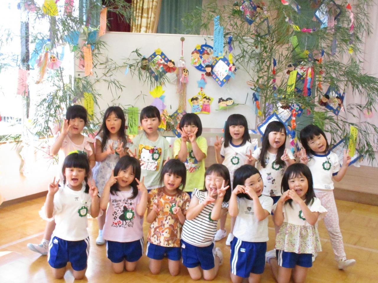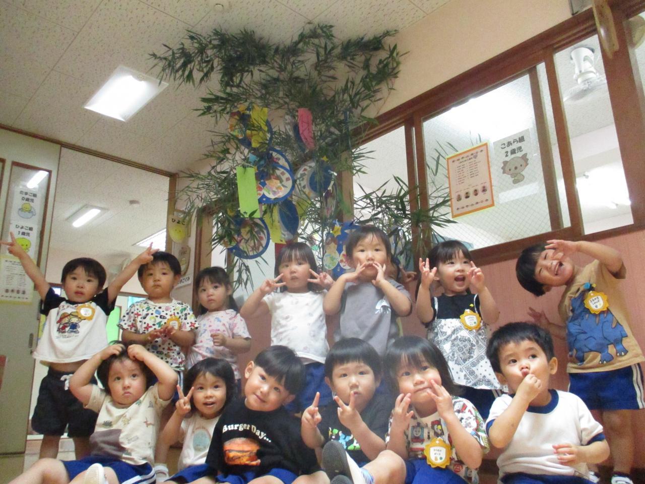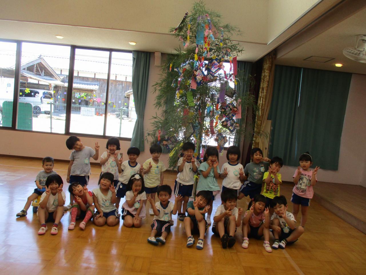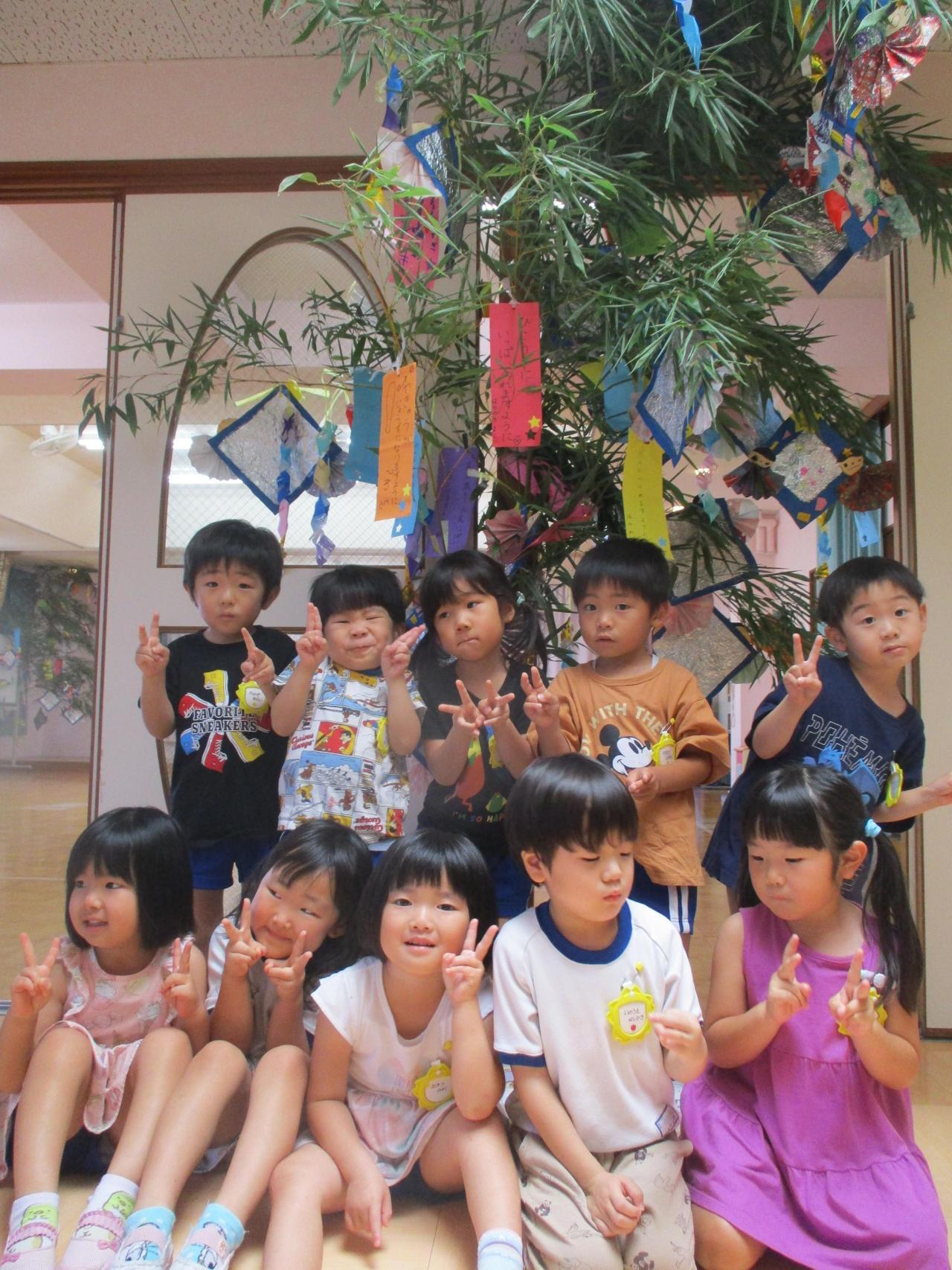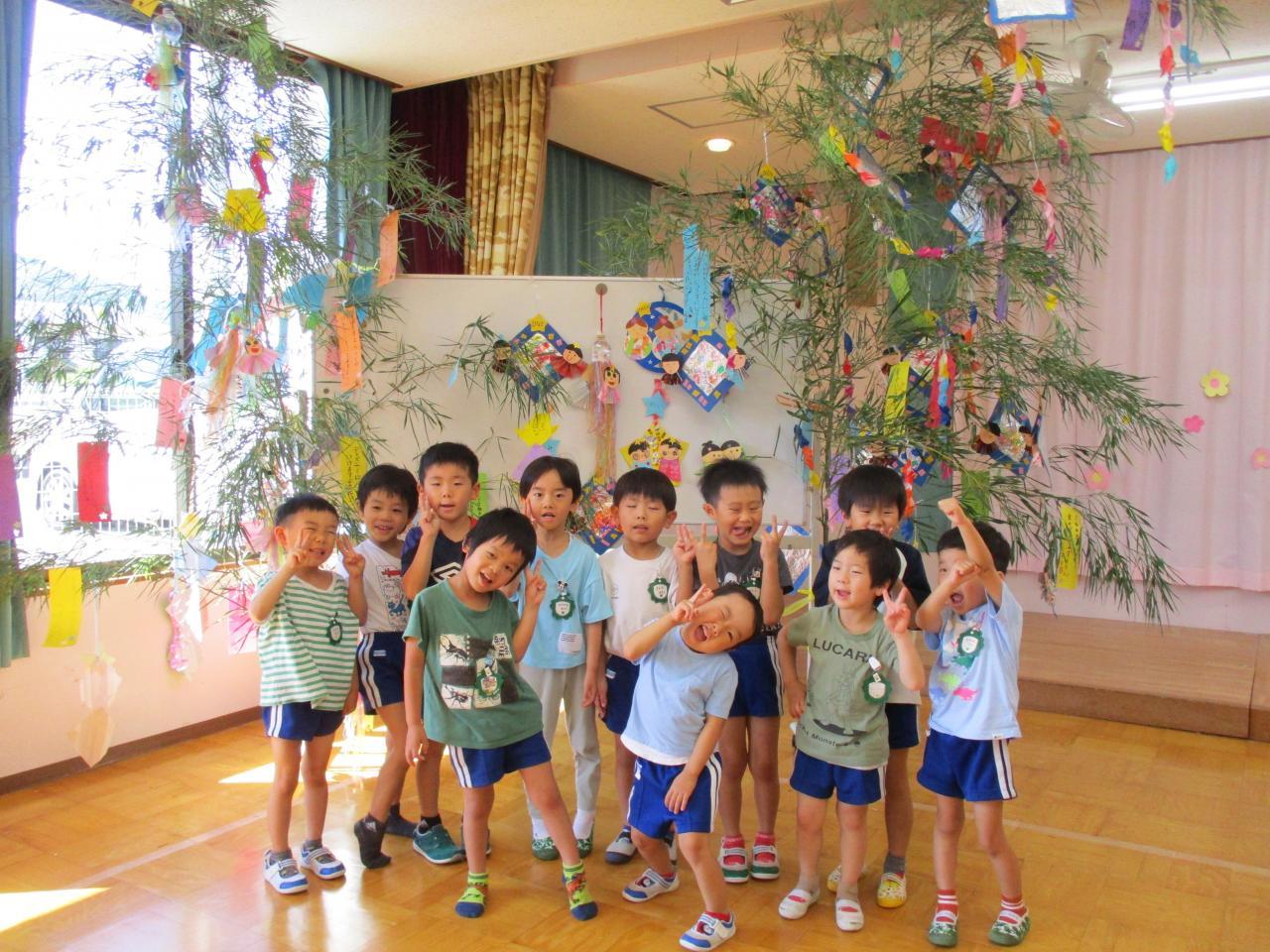 各クラスに1本ずつの笹があり、朝登園してきたお友達から、自分たちが作った笹飾りや短冊を笹に付けました。
