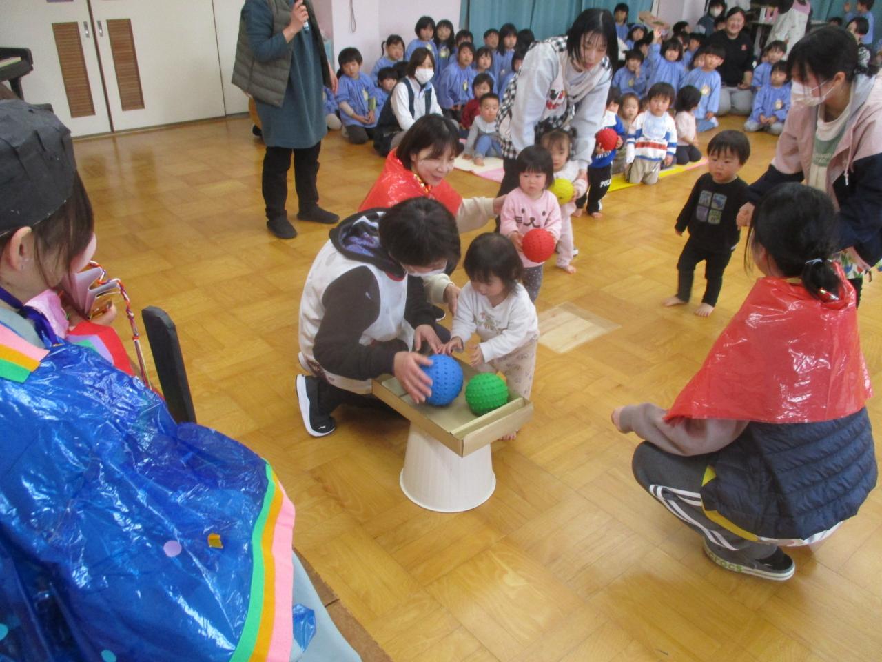 0.1.2歳児は、お雛様とお内裏様に着物などの衣装やあられに見立てたボールを持っていくゲームをしました🙂