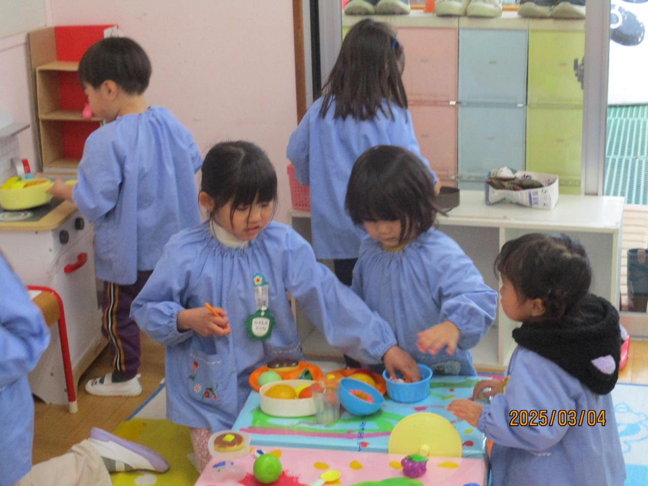 こあら組(保育室)とたまご・ひよこ組(遊戯室)に分かれて