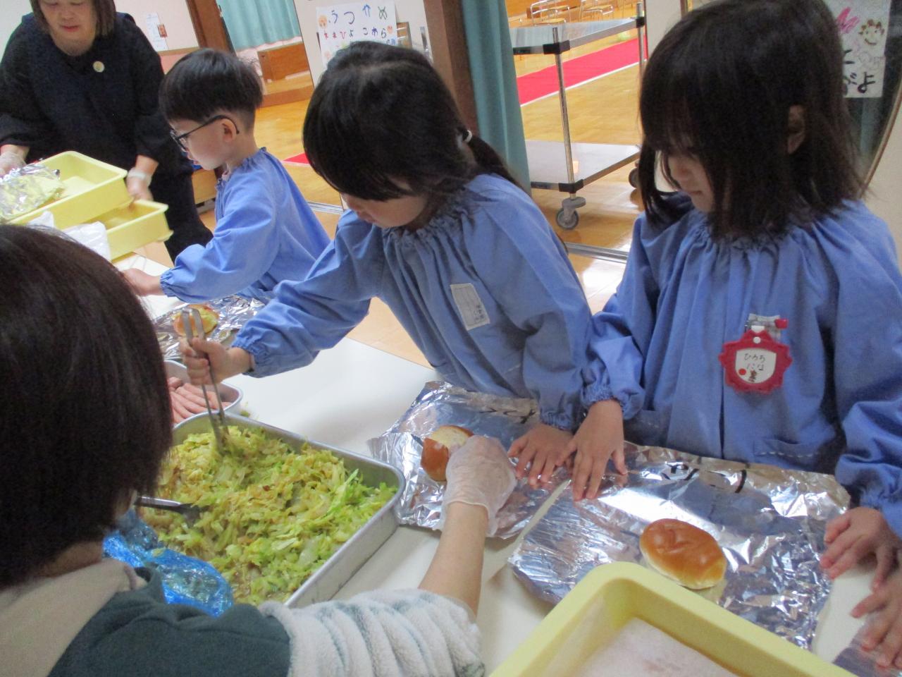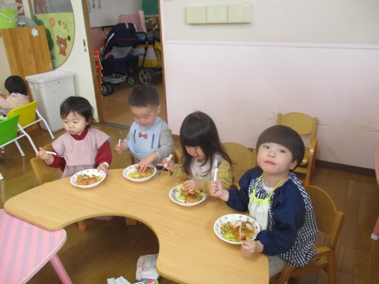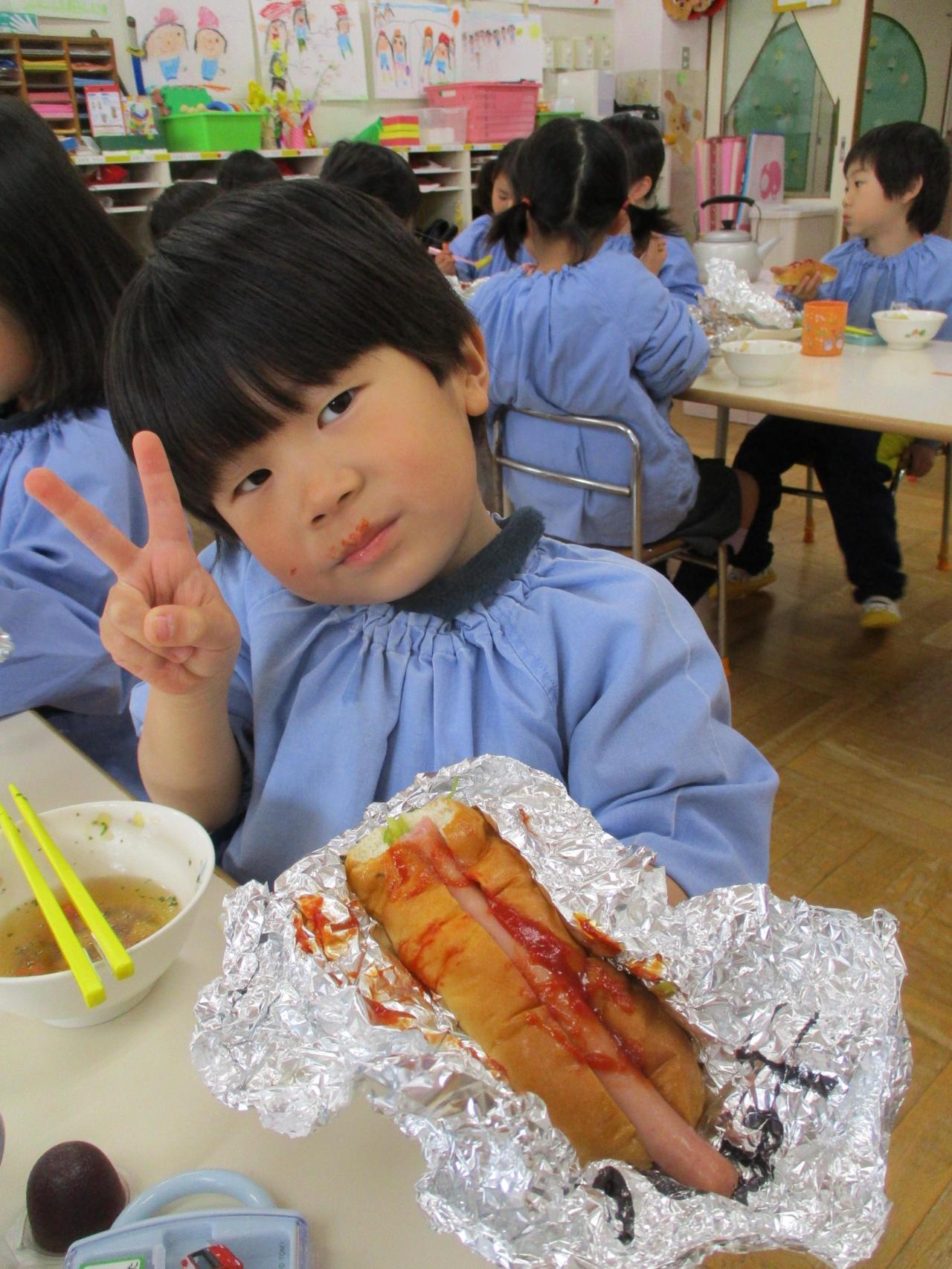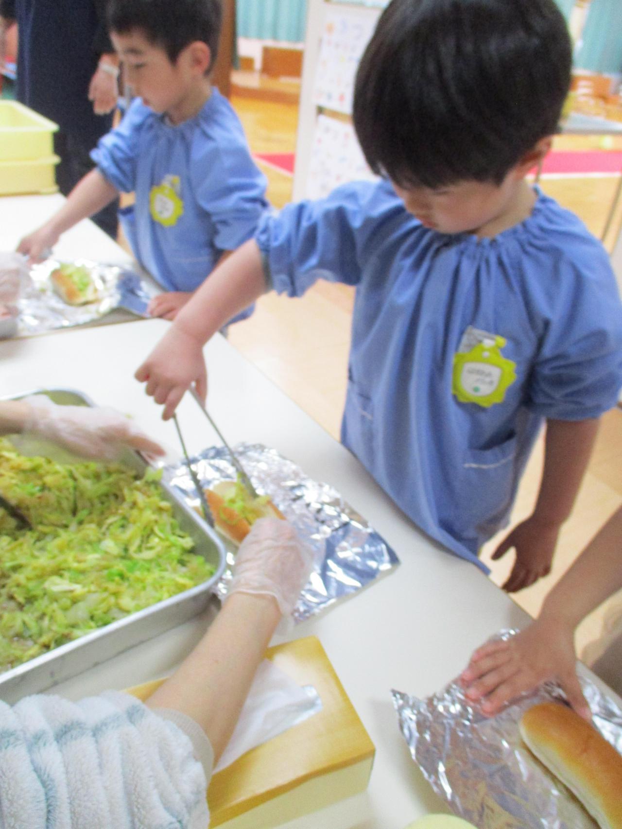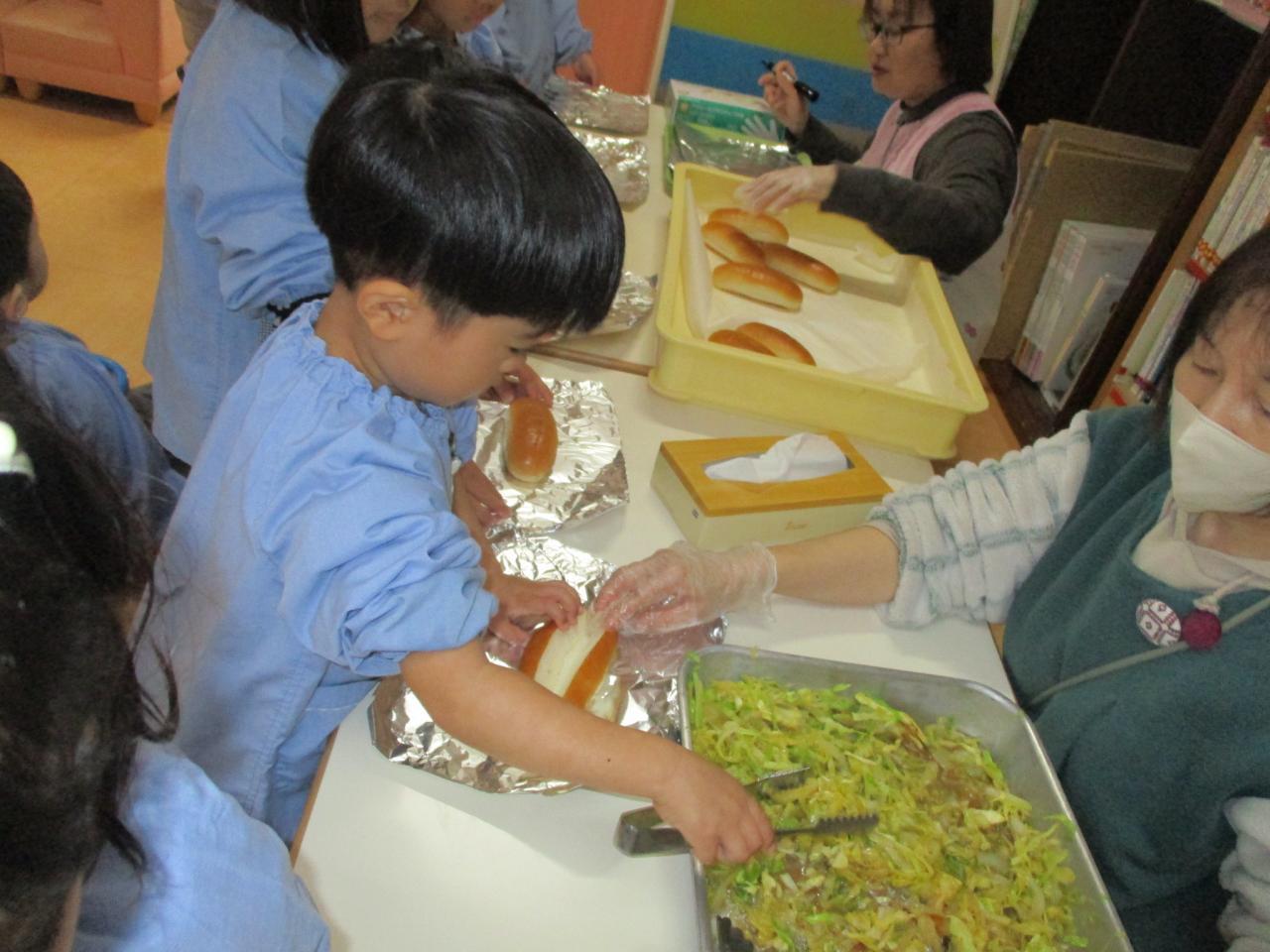 3、4、5歳児の友だちはパンの中に自分たちでトングを使って野菜、ウインナー、ケチャップを入れて作りました~。