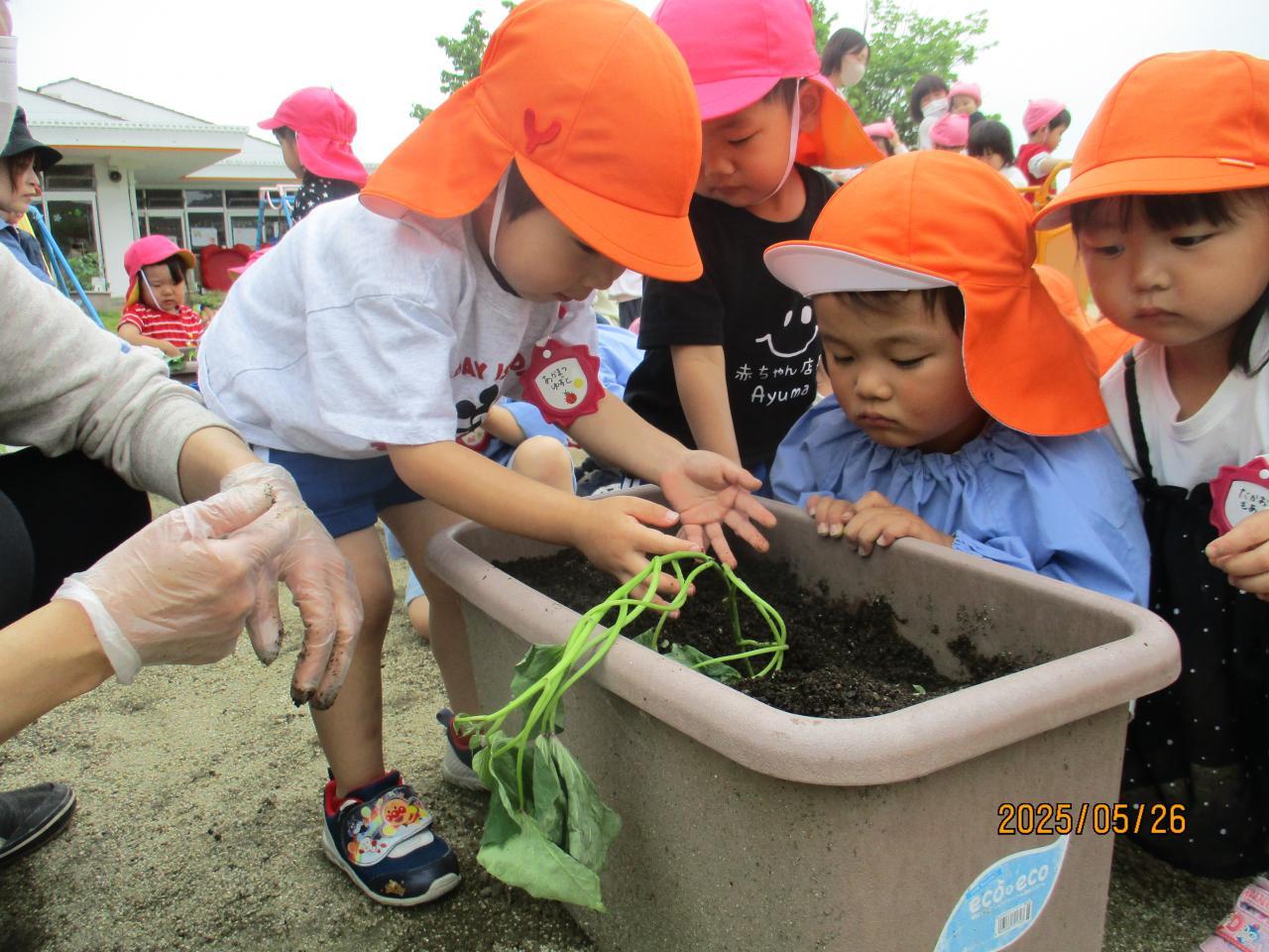 0歳、1歳、2歳、3歳のお友達は園庭のプランターにさつま芋を植えました。