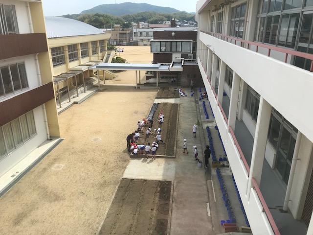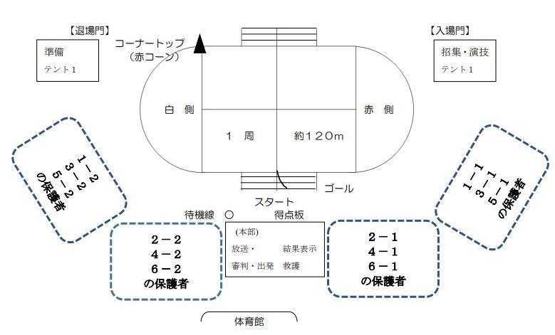 ・密を避けるために観覧用テントは設営せず、学級ごとにスペースを区切っています。(表現運動の演技場所を観覧場所の配置に合わせています。)ご協力をお願いします。