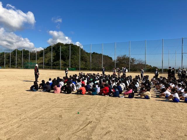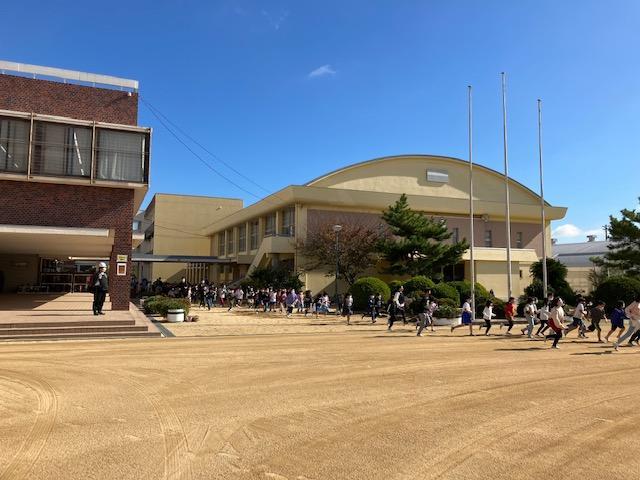 ◆一斉津波避難訓練(11月2日)。南海トラフ地震にともなう「大津波警報」の発令を想定し、運動場へ一次避難したあと津名高校へ二次避難を行いました。