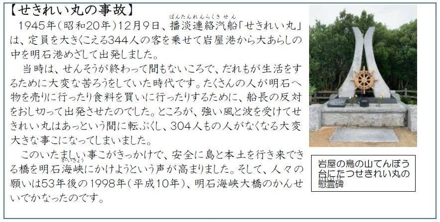 ◆せきれい丸は、岩屋と明石を結ぶ定員100名の連絡船でした。戦後間もない昭和20年(1945年)12月9日、定員をはるかに超える349名(乗客344名、乗組員5名)を乗せて岩屋港を出たせきれい丸は大きな波を受けて転覆し、304名の方が死者・行方不明者となりました。