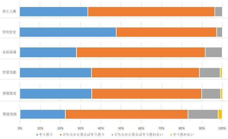 項目間の比較においては、「学校安全」の取組にはやや高い評価をいただいています。一方で、「家庭・地域との連携」の取組については低いポイントとなっていることがわかります。コロナ禍の中で保護者・地域の方に学校に来ていただく機会が少なくなっていることもその背景にあるのかもしれません。