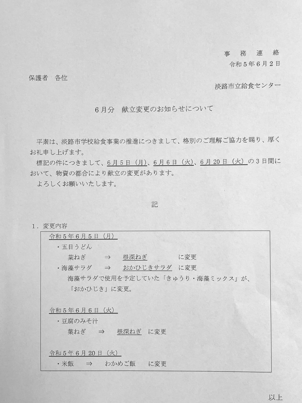 詳細については、「6月分 献立変更のお知らせについて」(下写真)をご覧ください。今後とも、安全、安心で美味しい給食について尽力してまいります。どうぞよろしくお願いいたします。