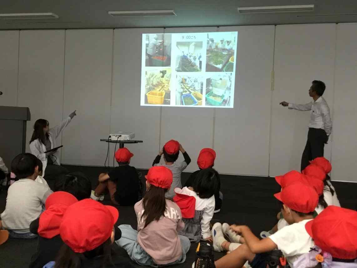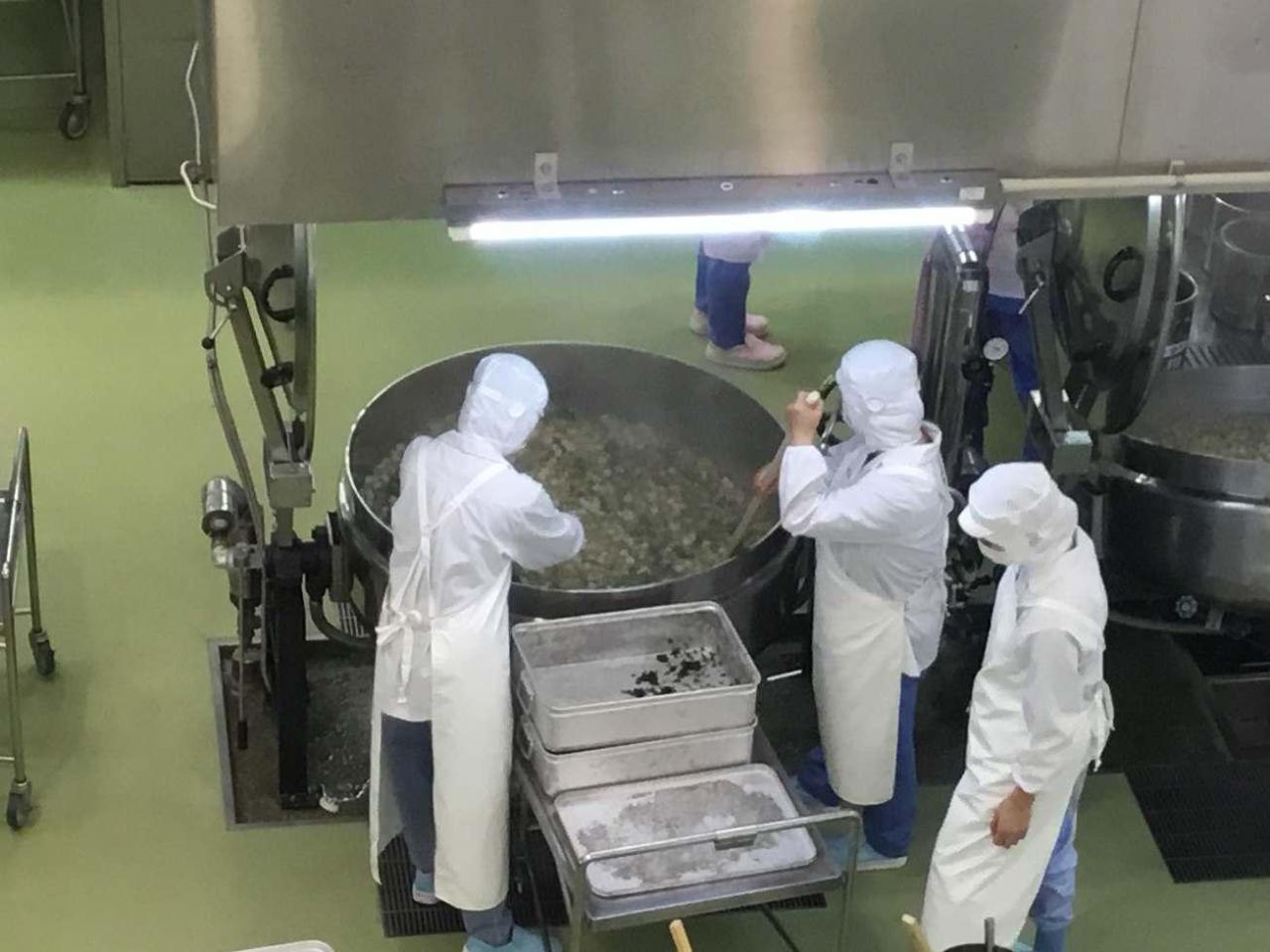 ◆センターでは、施設長さんや栄養教諭の先生から給食センターの仕事や調理の方法について説明を受けたあと、実際の調理の様子を見せていただきました。大きな鍋にいろいろな具材を入れたり、たくさんの食缶に取り分けたり…調理員さんのチームワークと手際よい所作に歓声が上がっていました。
