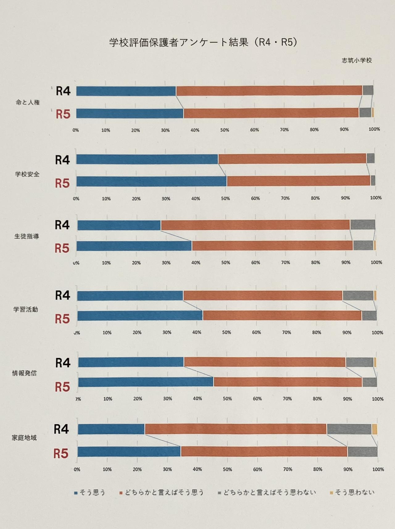 ◆昨年度(R4)との比較では、「学習活動」「情報発信」「家庭地域との連携」の項目においてプラス(向上)の評価をいただきました。一方で、項目間の比較においては、「家庭地域との連携」が依然低いポイントとなっています。”保護者・地域の皆様との連携の充実”は、引き続き重点課題であると考えられます。