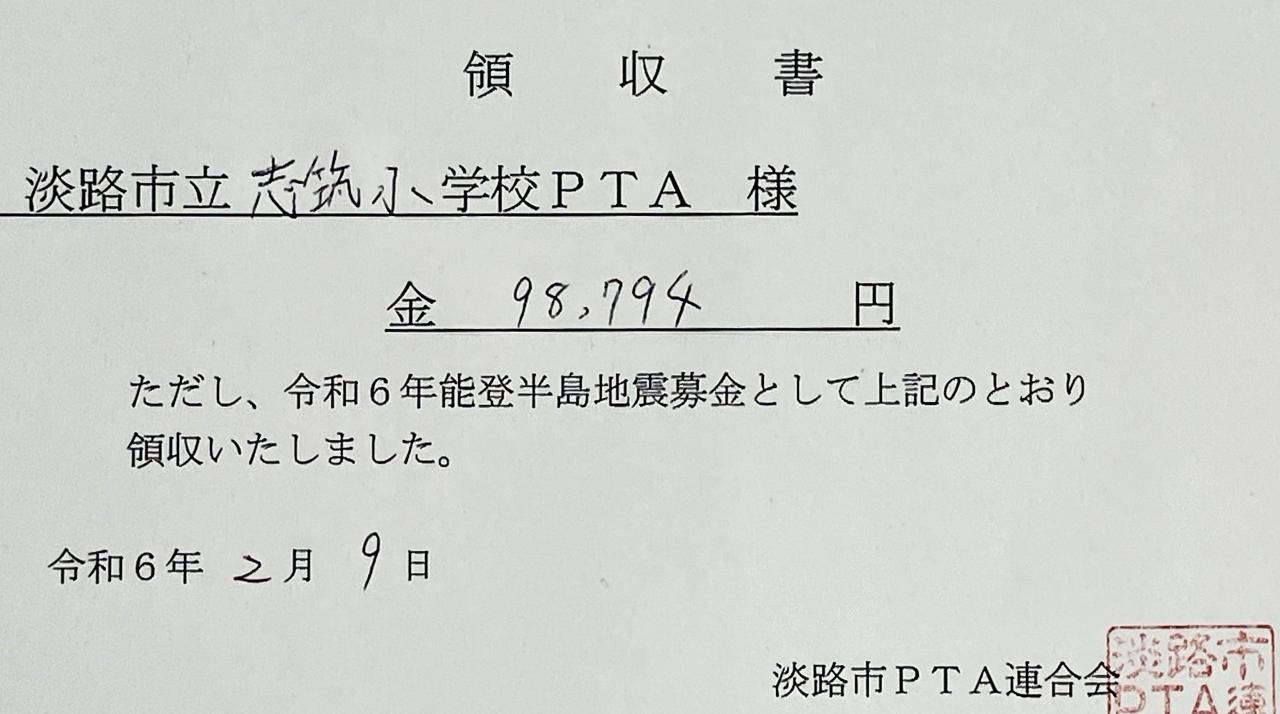 【PTA事務局】能登半島地震募金へのご協力ありがとうございました。総額98,794円を淡路市PTA連合会に寄託しました。