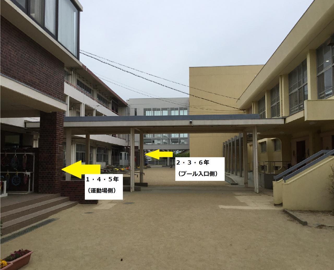 矢印入口からそれぞれお入りください(体育館へはスリッパのままでご移動ください)