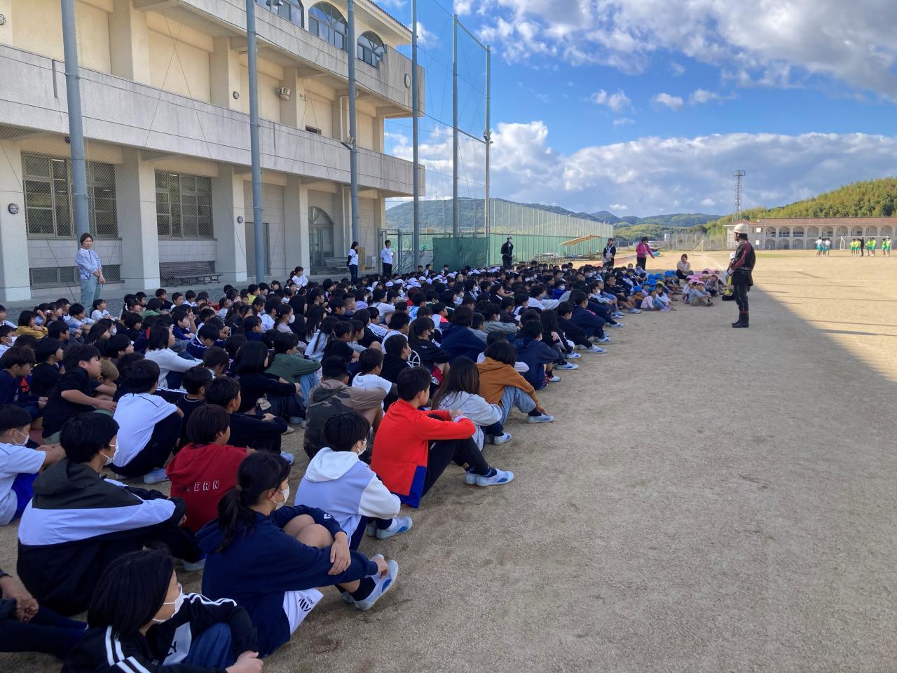 ●11月6日(火)避難訓練は、南海トラフ地震に伴う「大津波警報」の発令を想定し、運動場へ一次避難したあと、津名高校へ二次避難するというものでした。