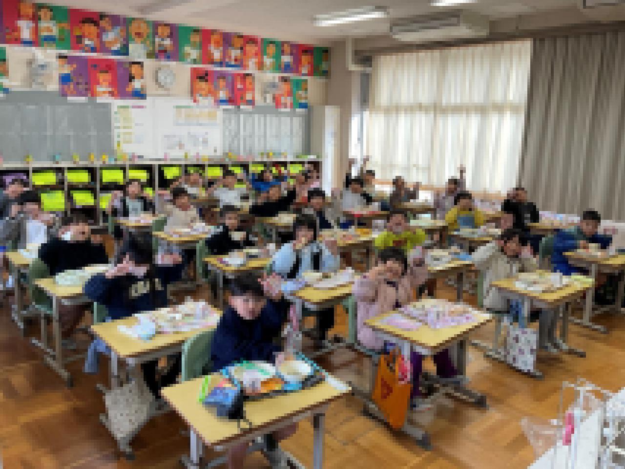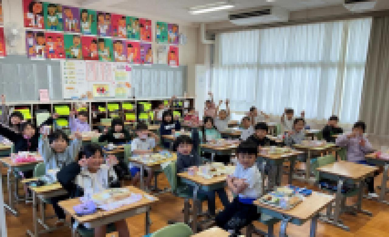 (1年生の教室で) しっかり食べて大きくなあれ